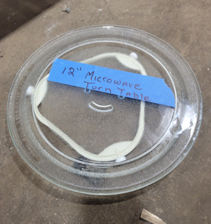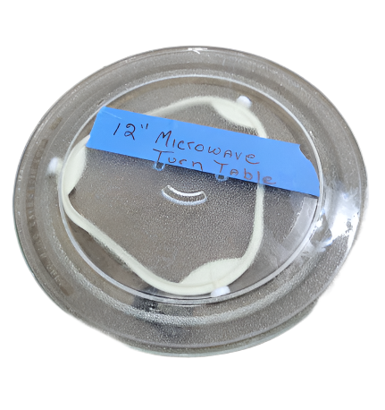 Description : Replacement 12" glass microwave turntable plate, includes integrated raised center ring and accompanying roller guide. Designed to rotate food evenly for thorough cooking. Clear tempered glass with circular traction ridges, compatible with many standard microwave models.