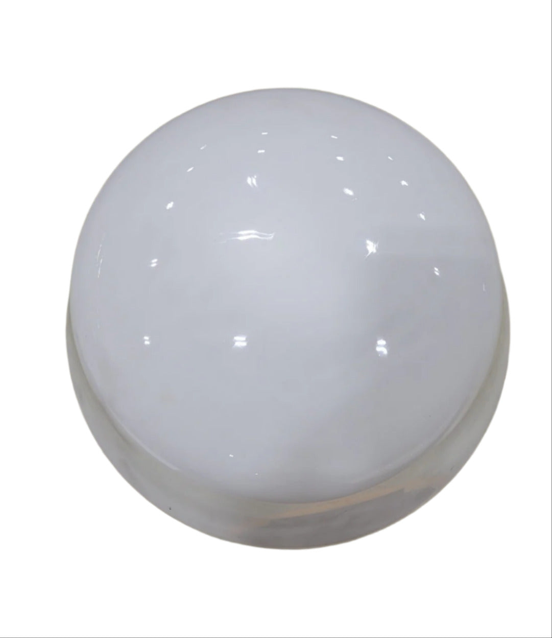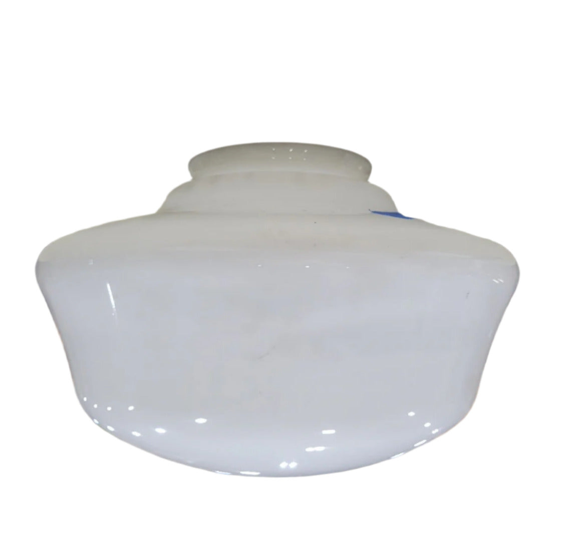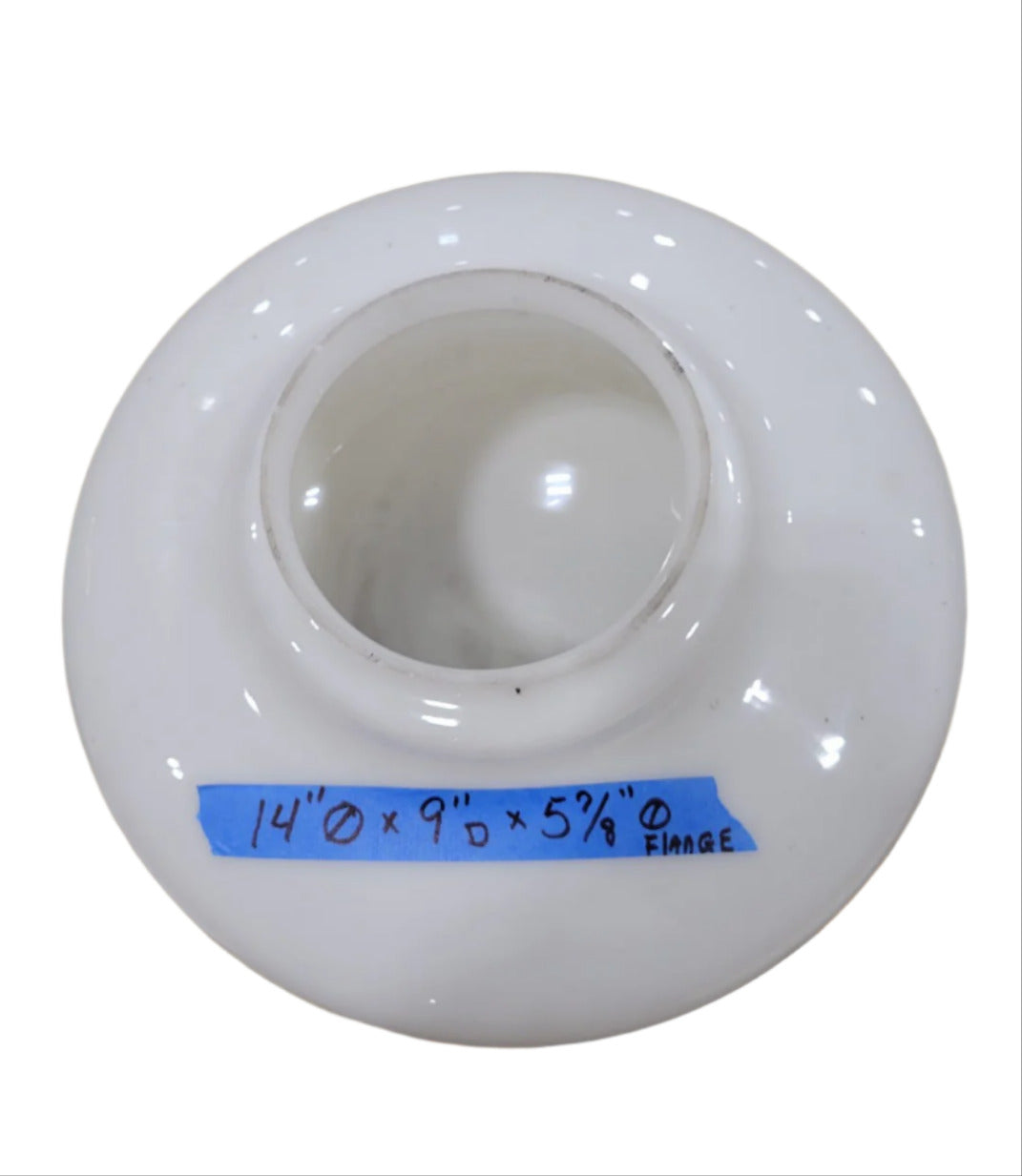 This 14" diameter milk glass light shade features a classic schoolhouse silhouette with a gentle bell-shaped contour, transitioning into a stepped flange with a 5⅜" opening. At 9" in height, this globe presents a slightly compact profile perfect for kitchens, foyers, or vintage industrial pendant lighting. The high-gloss opal finish evenly diffuses light, offering soft illumination. A few light scuffs and flecks near the flange are consistent with reclaimed glassware. No cracks or structural damage observed. A clean and timeless piece ready to elevate restoration projects or add character to new builds.