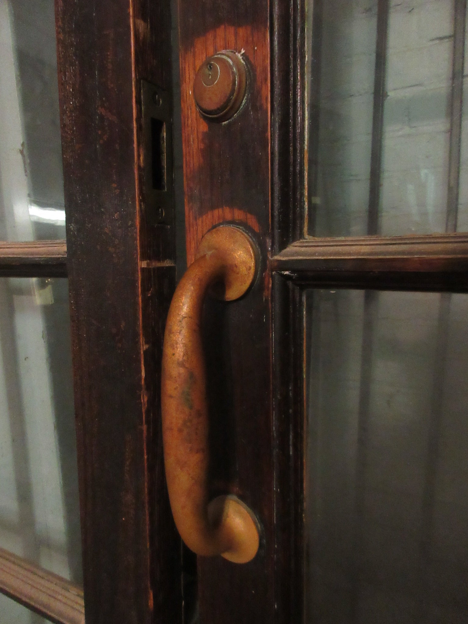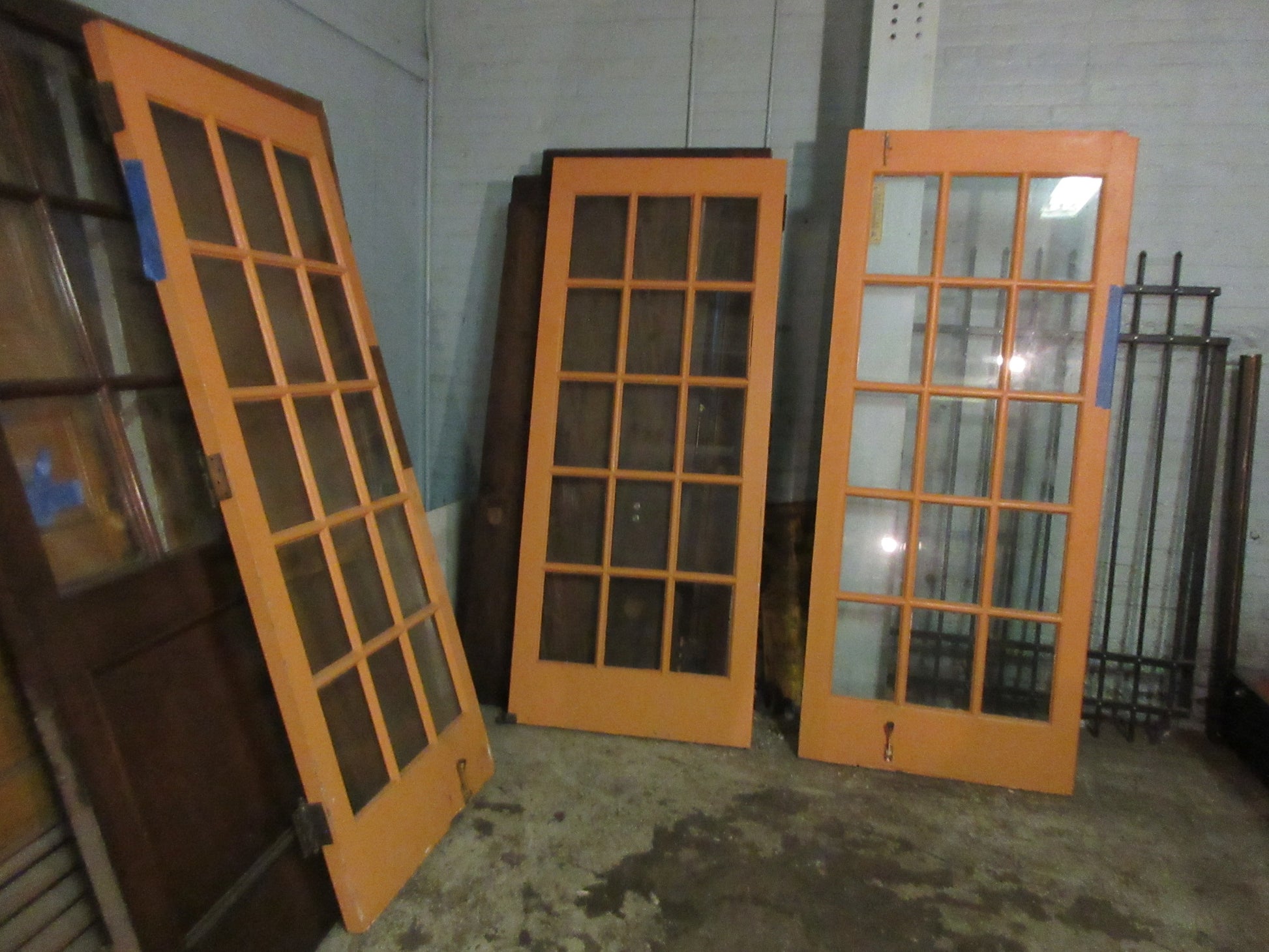 Description : Vintage French doors set of three, 15 lites with push handle and 4" hinges - stained on one side. Each door measures as follows: (2) 33 3/4"W x 81 1/2"H x 1 3/4"D (1) 33 1/2"W x 81 1/2"H x 1 3/4"D
