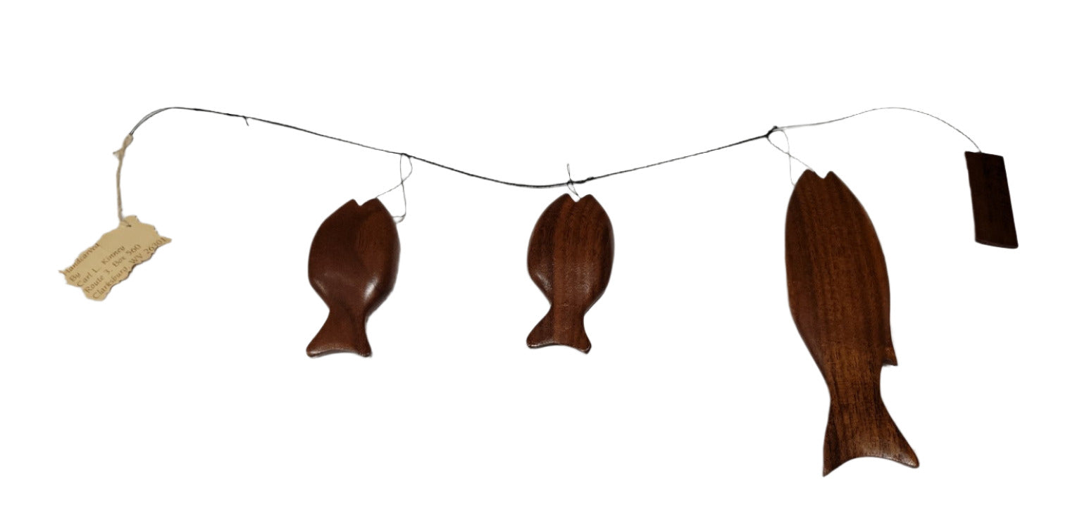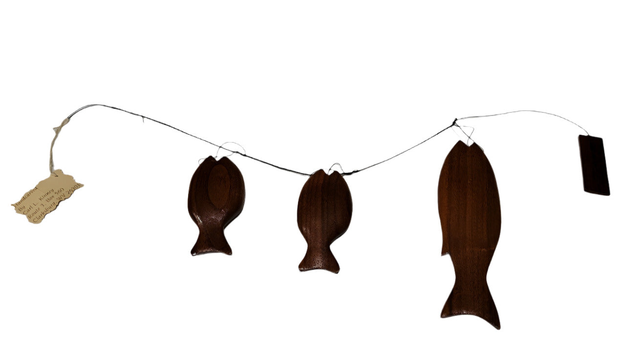 This handcrafted piece of wall art features three stylized fish—bass and sunfish—carved from solid black walnut and suspended in sequence on black wire. Created in 1957 by Carl L. Kinney of Clarksburg, West Virginia, the fish are delicately balanced and spaced to display vertically, designed for wall mounting. Each fish showcases smooth, hand-finished curves and rich walnut grain, celebrating both regional craftsmanship and natural materials. Signed and labeled by the maker, this artwork is a fine example of mid-century Appalachian folk art.
