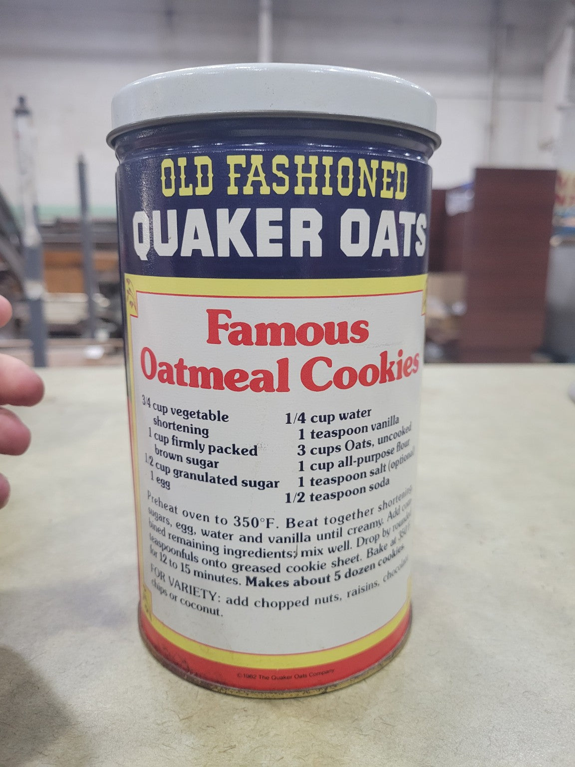This vintage 1982 Quaker Oats Limited Edition tin features the classic "Old Fashioned" Quaker Oats branding with bright red, white, and navy colors, and the iconic Quaker man illustration. The back displays the famous oatmeal cookie recipe, while the lid and bottom highlight the embossed Quaker Oats logo and commemorative 1982 stamp. Constructed from metal, this tin shows light surface wear appropriate for its age but retains vibrant colors and readable text, making it a charming piece for display or storage.