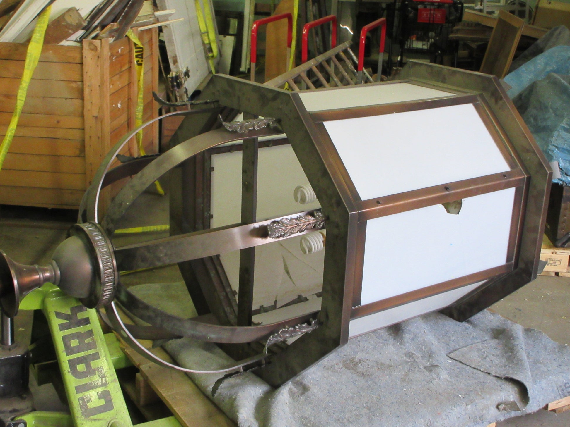 Description : Ceiling mount brass chandelier with textured white glass panes.