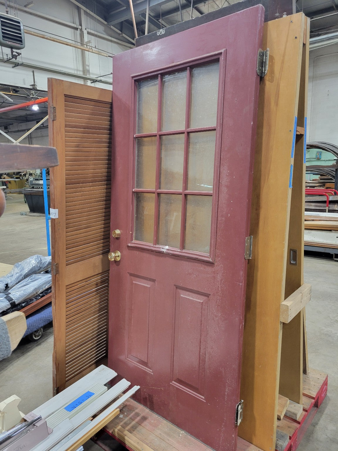 Classic 9-lite exterior metal door painted in deep red with a raised panel base. Features original brass hardware and clear divided glass panes (some damage to window trim with previous repair). A great choice for farmhouse entries, workshops, or rustic renovations seeking charm and durability.