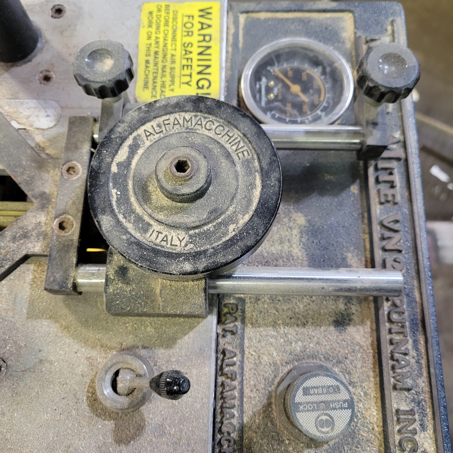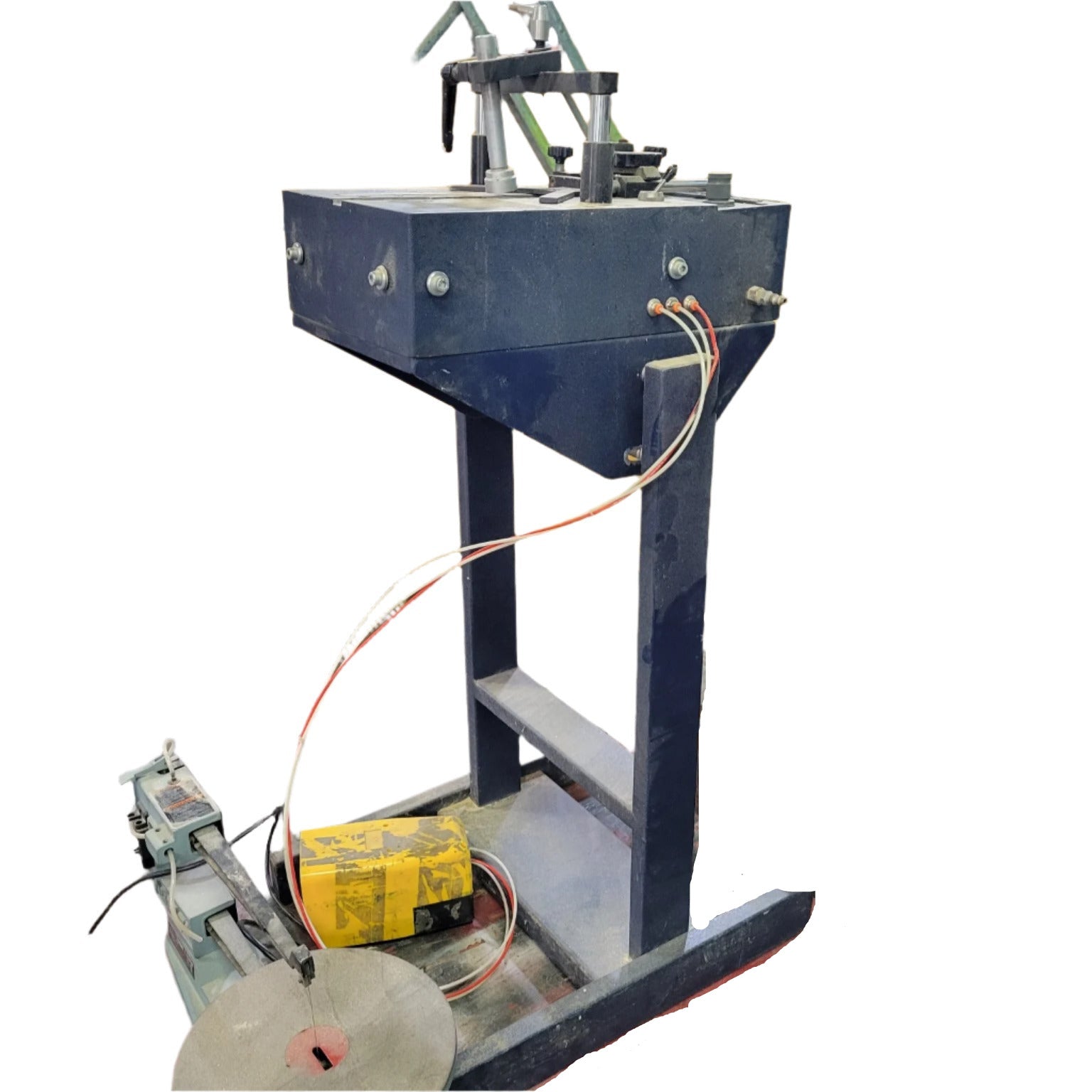 Description: The Alfamacchine VN2+1 is a joiner machine used for precision miter joining, often for woodworking, picture framing, or cabinetry. It features a solid base, adjustable clamps, and a high-torque motor for efficient and secure joint assembly. The unit includes a gauge for precision alignment and appears to be in used condition with visible dust and wear, indicating prior use in an active workshop.