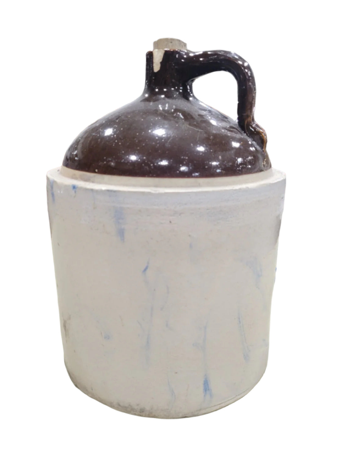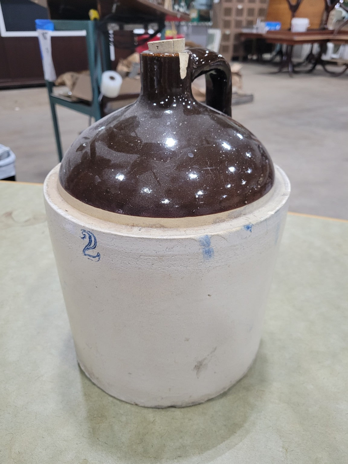 This antique stoneware jug features a two-tone design with a hand-applied handle and dark brown glazed upper section, transitioning into a natural stone base. Likely used historically for storing spirits, cider, or vinegar, the jug has an iconic form, stamped with a cobalt blue "2" indicating its two-gallon capacity. The thick walls and sturdy base reflect utilitarian craftsmanship, and the cork top is still intact. There is a notable chip on the handle but no visible cracks through the body. Displays blue kiln drips from the glazing process, common in 19th- and early 20th-century crocks and jugs.