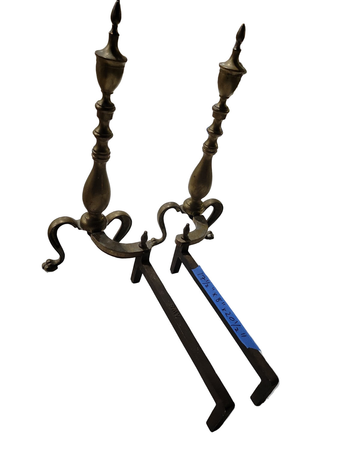 Sand-cast brass bodies with wrought iron fire dogs, hand-finished detailing on legs and finials.
