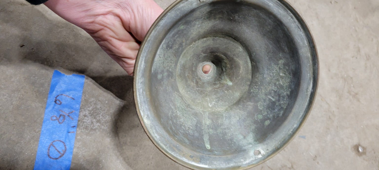 This is an antique brass light fixture canopy, likely from the early to mid-20th century. It features a classic domed design with a central hole for wiring and three mounting holes along the outer rim. The surface has a naturally aged patina, giving it an authentic vintage look.