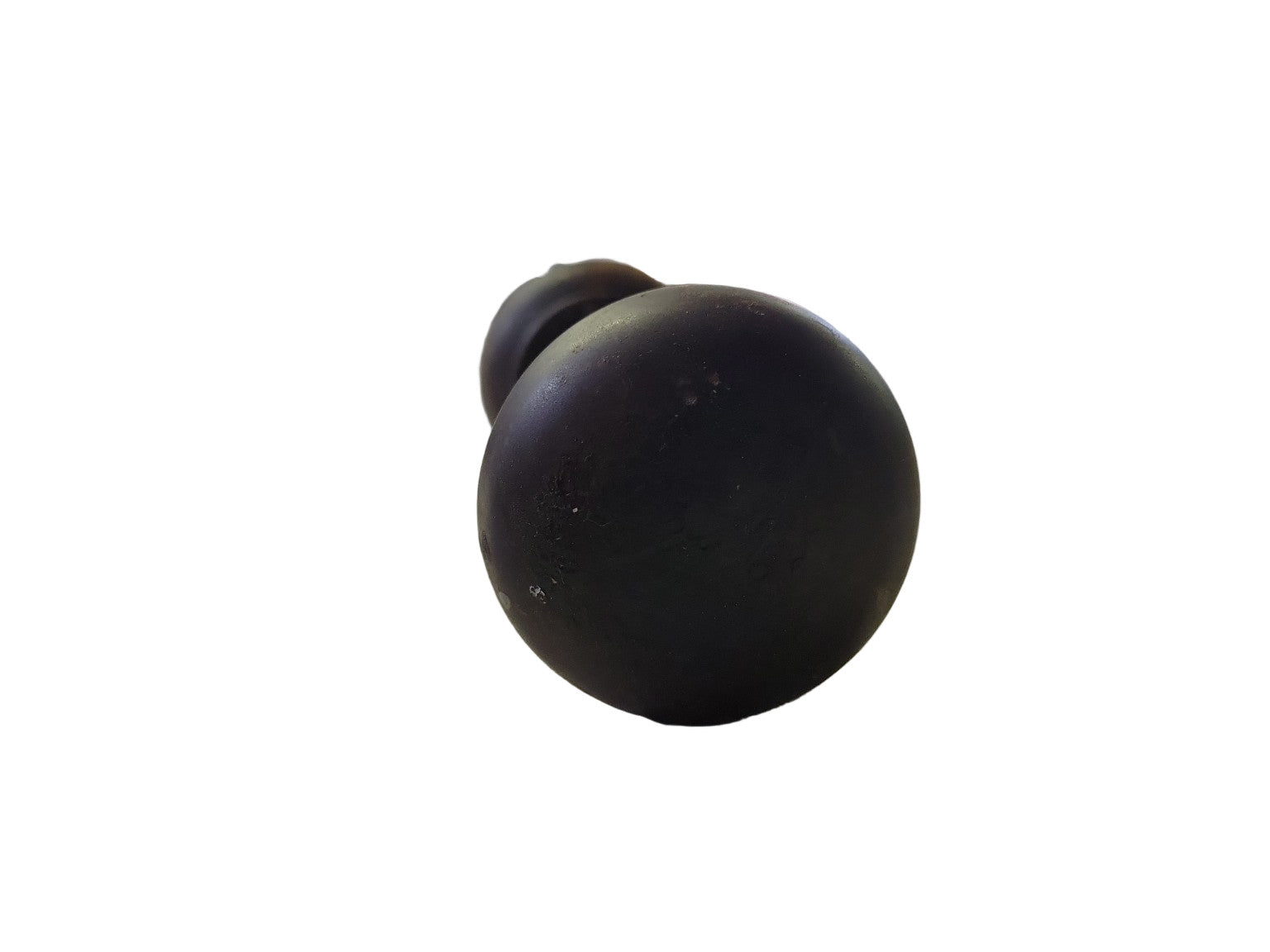 This antique door knob set features two simple, rounded steel knobs with a warm bronze-brown patina, joined by a threaded steel spindle. Measuring 2 1/4" in diameter with an overall depth of 6", the set has a smooth, unadorned profile that suits both period restoration projects and minimalist vintage-inspired interiors. Light surface wear and oxidation are present, enhancing its authentic aged character.
