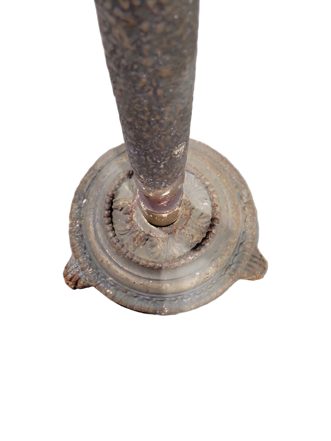 This elegant antique floor lamp base stands 52" tall with a turned central column and richly detailed cast iron base. Measuring approximately 10 ½" in diameter at the base, this piece showcases traditional craftsmanship with its fluted and ringed midsection. The iron is aged with a patinated rust finish, adding a sense of authentic vintage character. It is a solid candidate for rewiring and re-shading or could be repurposed into a standing sculpture, plant stand, or candelabra. A strong structural piece ready for creative re-use or restoration.