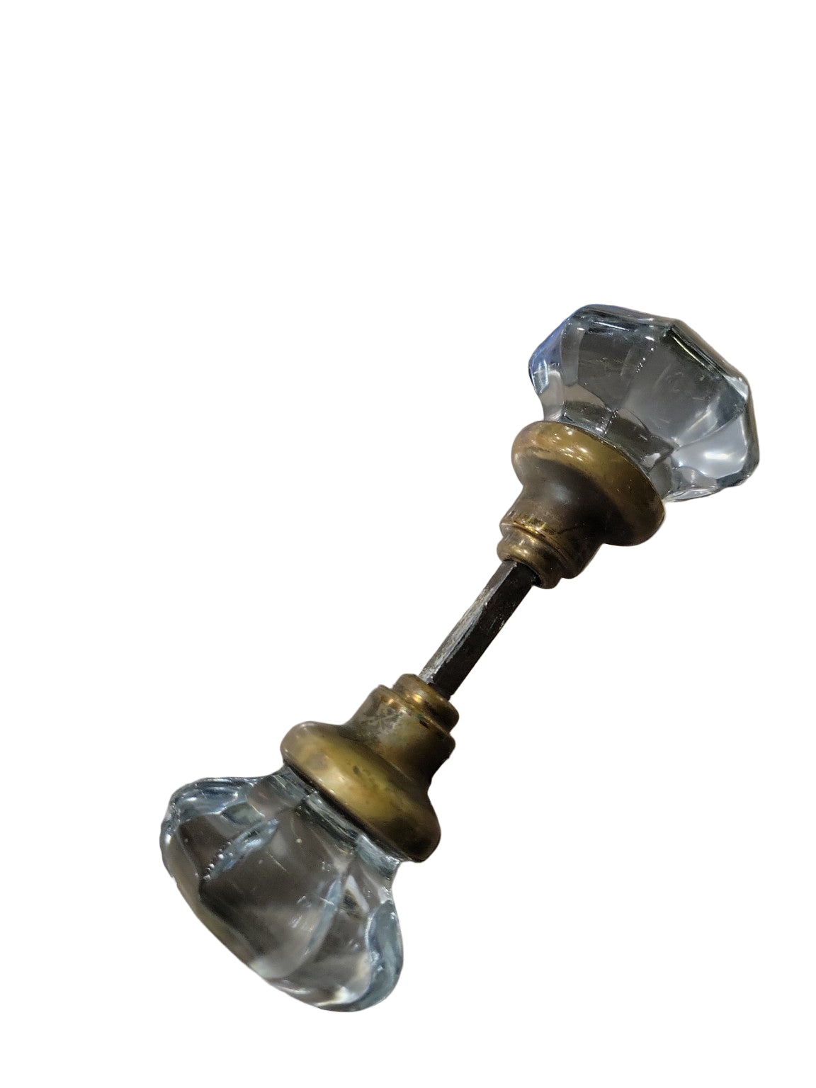 This antique clear glass door knob set features two stunning 12-point leaded glass knobs mounted on solid brass collars with a connecting steel spindle. Each knob measures 2 ¼" in diameter, with an overall length of 6 ½". One knob remains in perfect condition, while the other shows a small chip in the leaded crystal, which does not affect functionality or installation. The brass collars have developed a rich, natural patina, enhancing the piece’s authentic early 20th-century character. Ideal for period home restoration or as a replacement set for antique mortise door hardware.