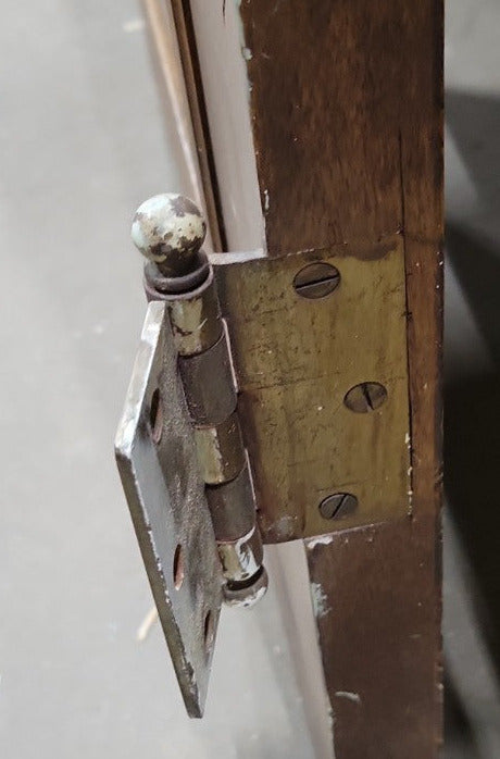 This antique interior door features a full-length mirror inset into a richly stained solid wood frame. The reverse side displays a classic two-panel configuration with clean edges and deep woodgrain character. Retaining its original brass doorknob and keyhole escutcheon, the piece includes ball-top finial hinges, stored in a protective bag for reinstallation. A striking combination of utility and elegance, this door works beautifully as a closet, dressing room, or decorative pivot door.