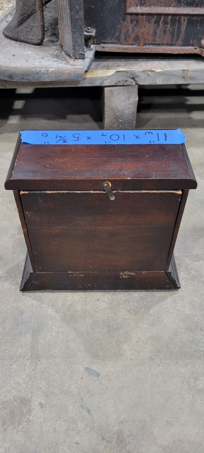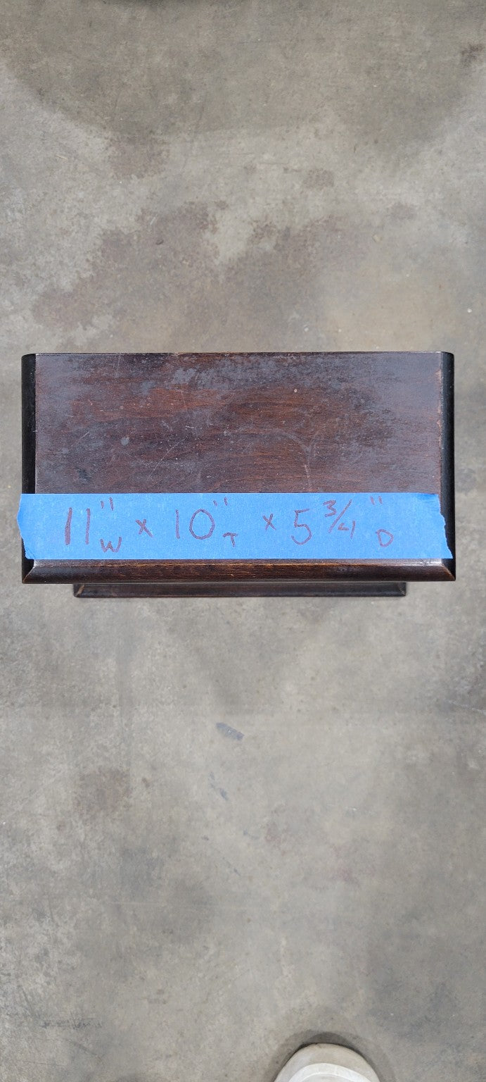 Classic wooden mantel clock featuring a brass-tone face with Roman numerals and sweeping hands, set within a rectangular dark-stained wood case with molded base and top. The rear has a hinged panel for accessing the clockwork.