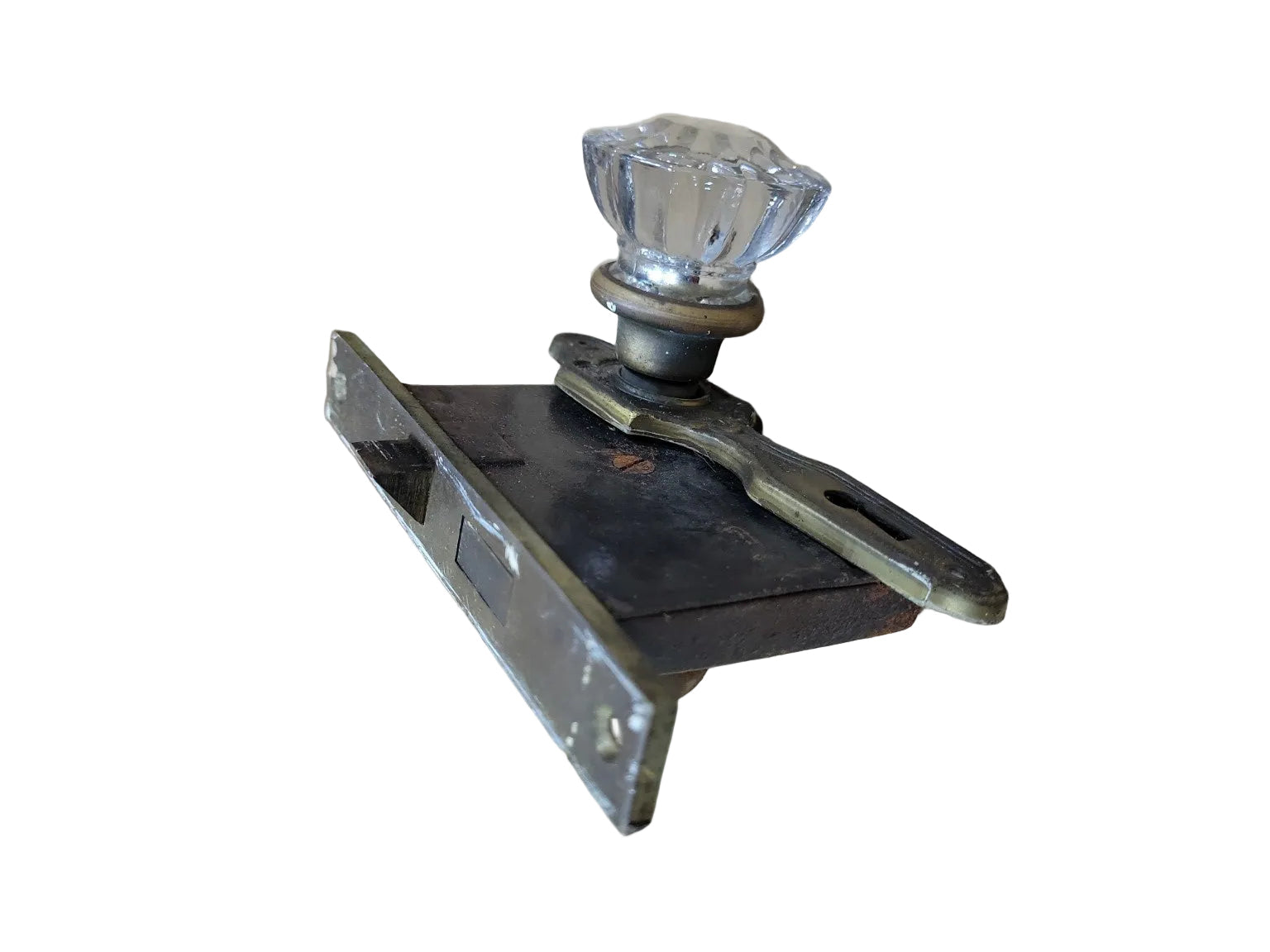 This salvaged antique mortise lock set features a classic combination of a clear faceted glass knob paired with a worn brass knob, mounted on an original steel lock body. The decorative brass backplate includes a keyhole, suggesting it once functioned as a locking interior door set. The piece shows age through surface rust, patina, and wear, adding authentic character ideal for restoration or reuse in vintage-inspired interiors. The compact mortise design allows it to be recessed into a door, making it both functional and historically accurate for older homes. Measurements noted on the tape indicate a compact form, suitable for interior residential doors.