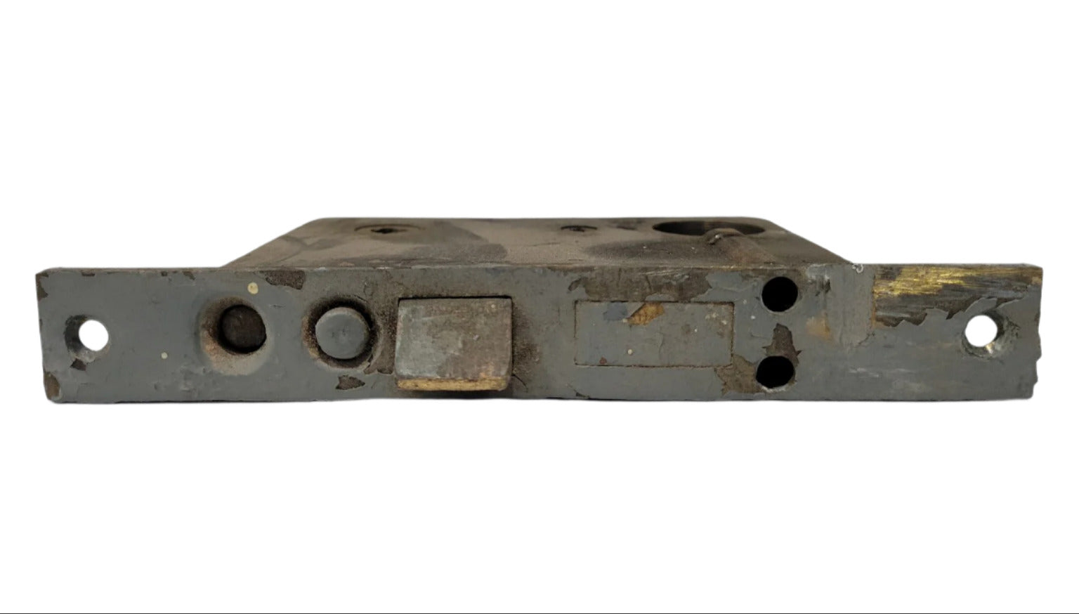 This antique mortise lockset, manufactured by the Norwalk Lock Company, features a durable steel body with remnants of its original brass or bronze plating. Measuring 5" tall, 3 ¾" deep, and ¾" wide, it offers a 2 ¾" backset. The piece includes both knob and key spindle holes and a rectangular latch. A classic example of early 20th-century American hardware, ideal for restoring vintage doors or replicating period interiors.