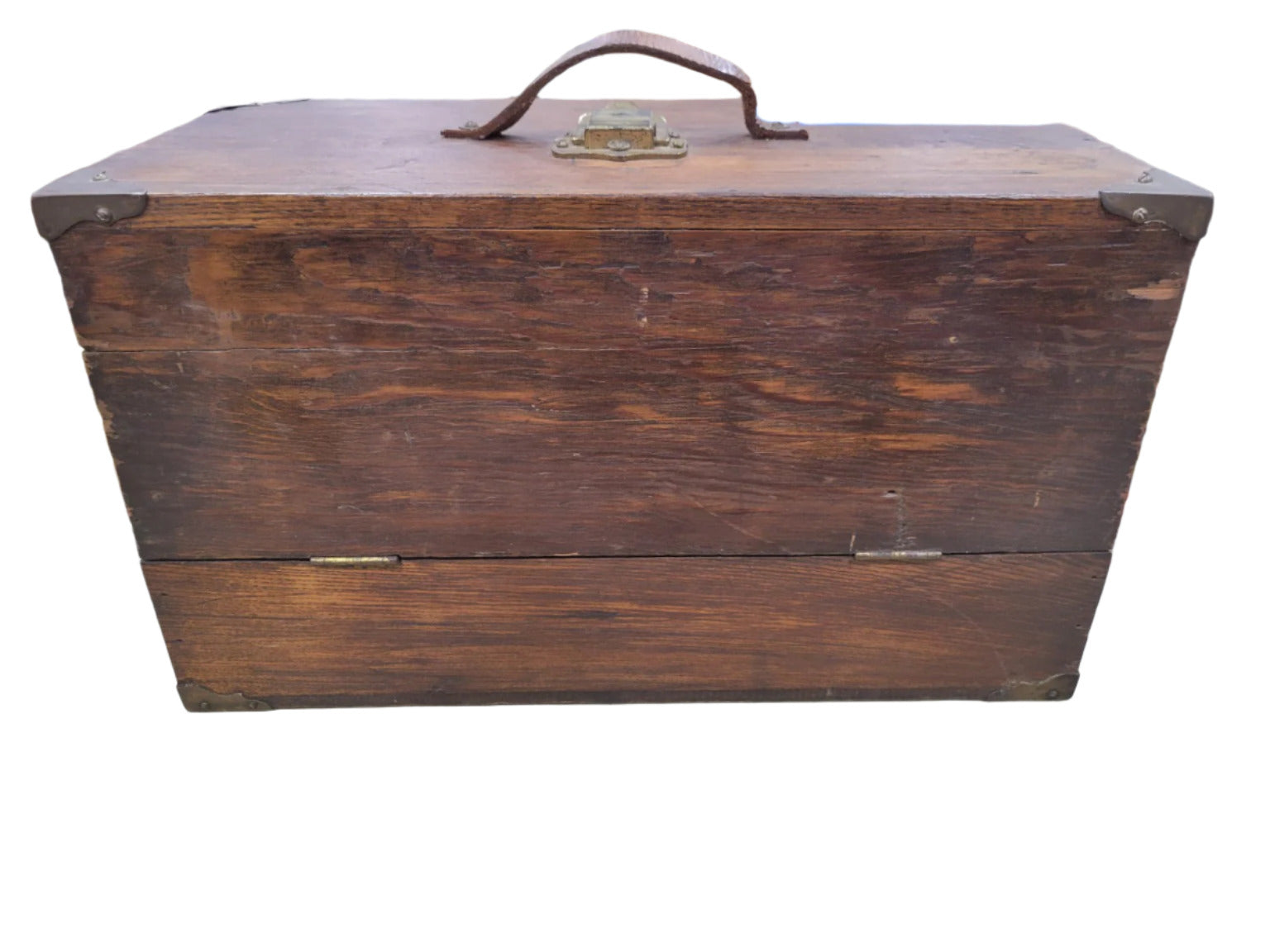 This handsome antique machinist’s chest is crafted from solid oak and features a drop-front panel that reveals two shallow drawers and a larger storage compartment below. Reinforced with metal corner brackets and a rugged leather carrying strap, this chest was built for durability and mobility. It retains its original warm, aged patina, brass latch, and vintage hardware. Ideal for collectors, crafters, or anyone seeking authentic industrial decor, this piece shows honest wear consistent with heavy shop use but remains structurally sound.