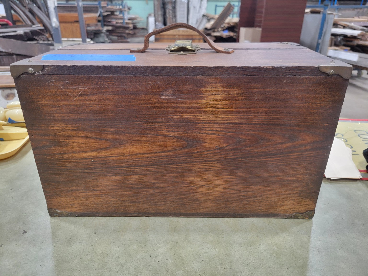 Hand-joined solid oak panels, hand-cut brass hardware, metal corner protectors
