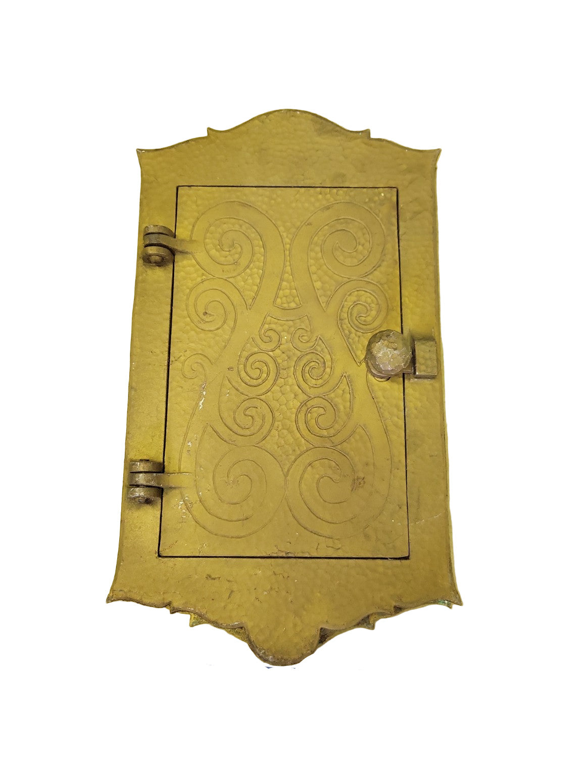 This antique cast brass door grille, manufactured by Mical, features ornate scrollwork, a hinged interior privacy door, and an integrated exterior knocker. Measuring 6 ⅛" W x 11 ¼" H, it was designed for installation into entry doors, allowing homeowners to see and speak to visitors while maintaining security. The hinged rear panel opens for an unobstructed view, while the exterior knocker offers a traditional greeting element. Crafted with a hammered border and decorative scroll-cut details, this piece retains its original patina and showcases the craftsmanship of early 20th-century hardware makers.