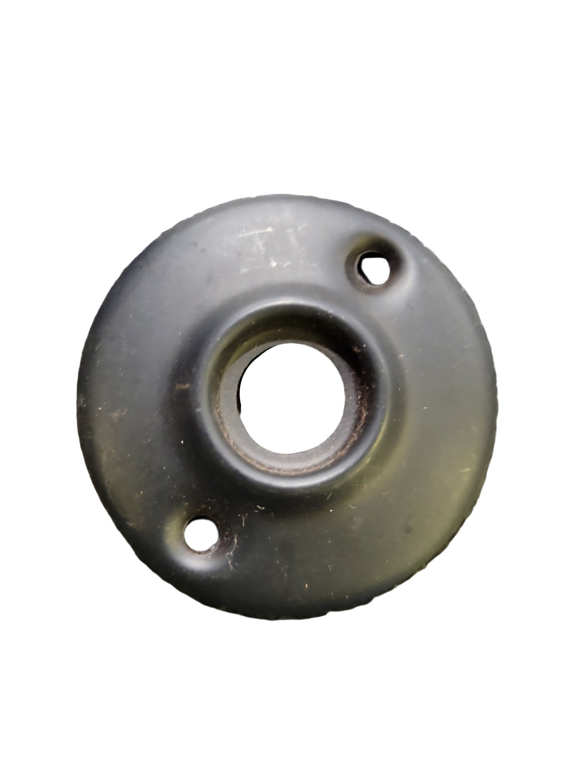 This antique round door rosette is a classic backplate used behind a doorknob or spindle. Measuring 2 inches in diameter, the piece features a clean, domed profile with a central collar and two mounting holes. Its aged blackened surface and exposed underside reveal a solid metal construction, likely steel or brass, originally used in interior hardware assemblies. This rosette is perfect for restoring vintage doors or pairing with glass, porcelain, or brass knobs in traditional settings.