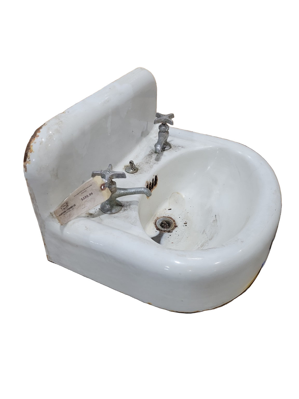 This antique enameled cast iron wall-mount sink by Standard Sanitary Manufacturing Co. features a compact design with a rolled rim, high backsplash, and original chrome-plated cross handles. The underside bears the classic “S” Standard Sanitary hallmark. The enamel surface shows light rust at the drain and edge wear consistent with age, but remains solid and structurally sound. This sink represents a quintessential early 20th-century utilitarian design—ideal for vintage restorations, farmhouse bathrooms, or adaptive reuse in modern spaces.