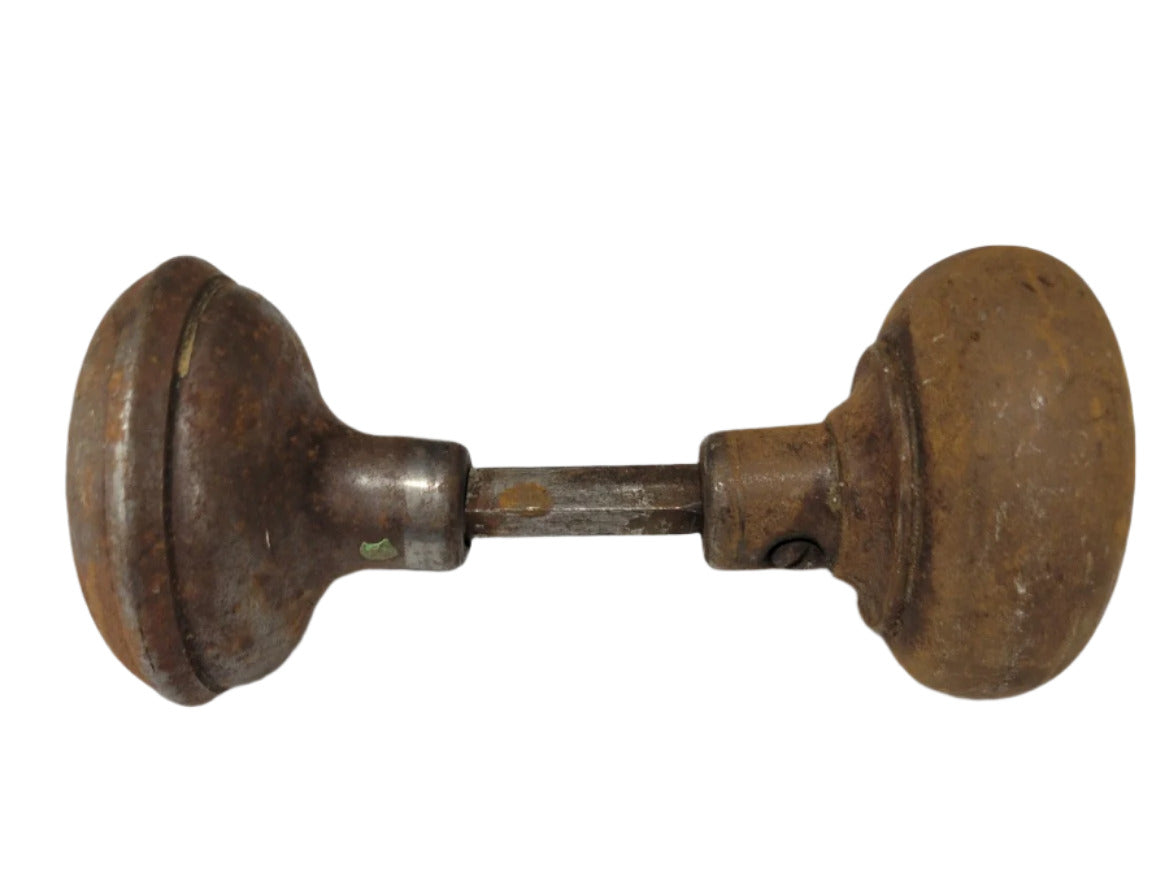 This antique steel door knob set features two matching knobs joined by a fixed spindle and set screws. Measuring approximately 2 ⅜" in diameter, the knobs have a smooth dome profile with a subtle stepped base, showcasing classic utilitarian design from the early 20th century. Both knobs exhibit a naturally aged patina with surface oxidation, adding to their vintage authenticity. This set is a suitable choice for restoration of early residential or industrial doors, especially for those seeking to preserve original architectural details.