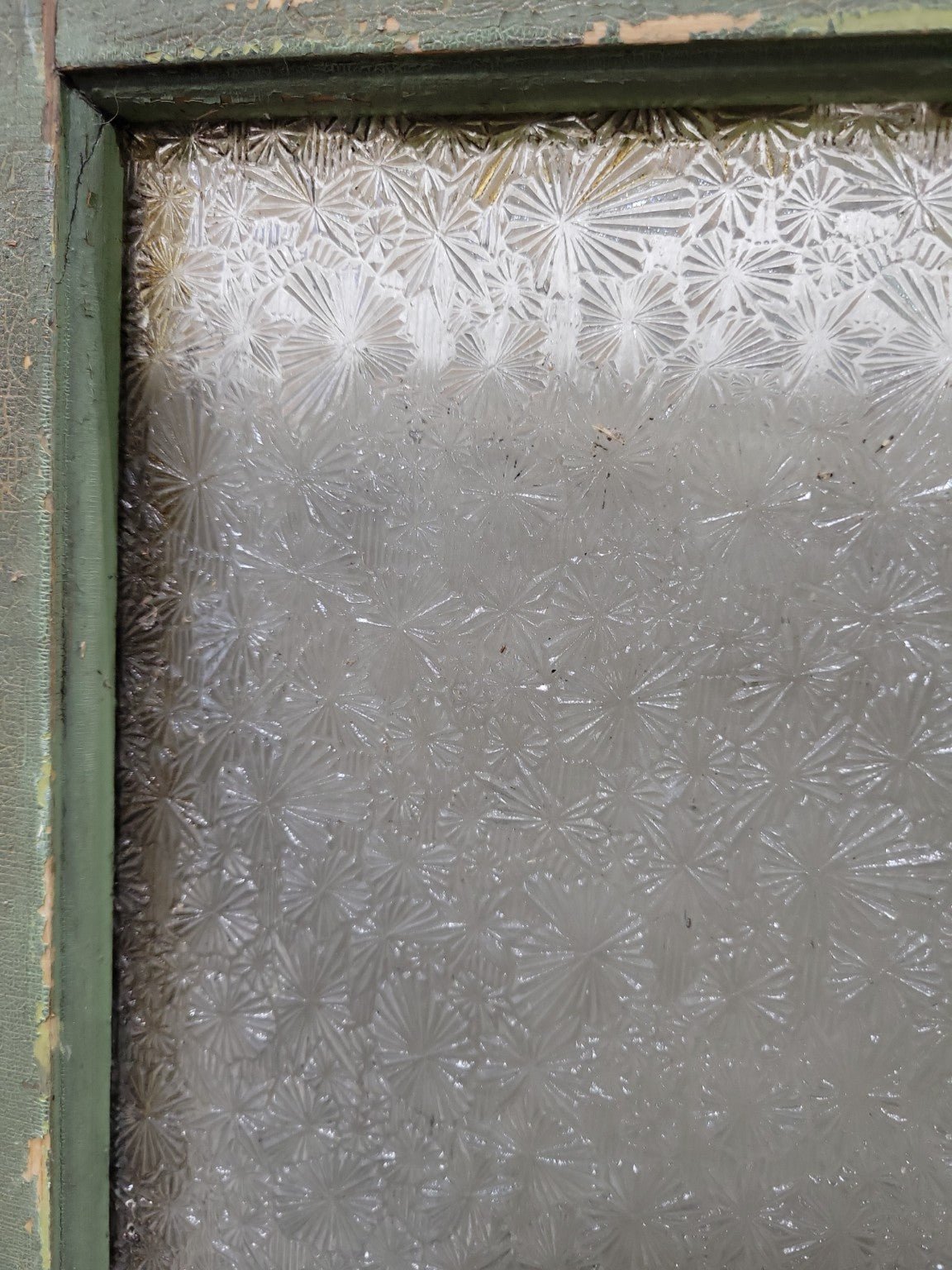 Description : This salvaged antique window features two textured privacy glass panes within a solid wood frame finished in aged green paint. The pebbled and daisy-star pattern on the glass adds vintage character and diffuses light while maintaining privacy, making it ideal for bathroom, pantry, or decorative repurposing. With one hinge still attached, it shows signs of prior use and authentic wear, perfect for reuse in restoration projects or as a standalone rustic accent piece.