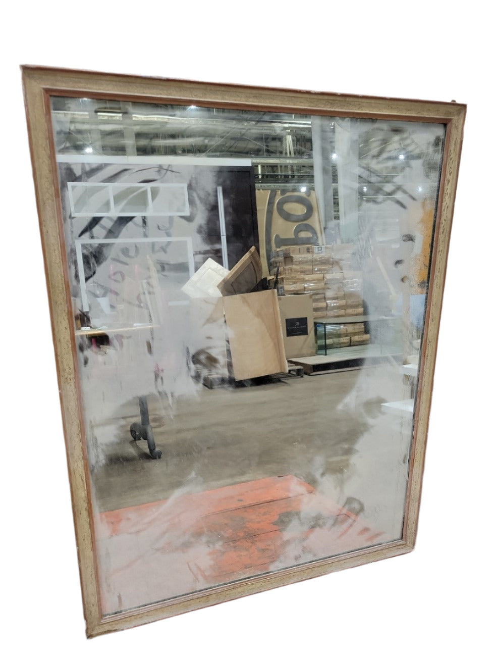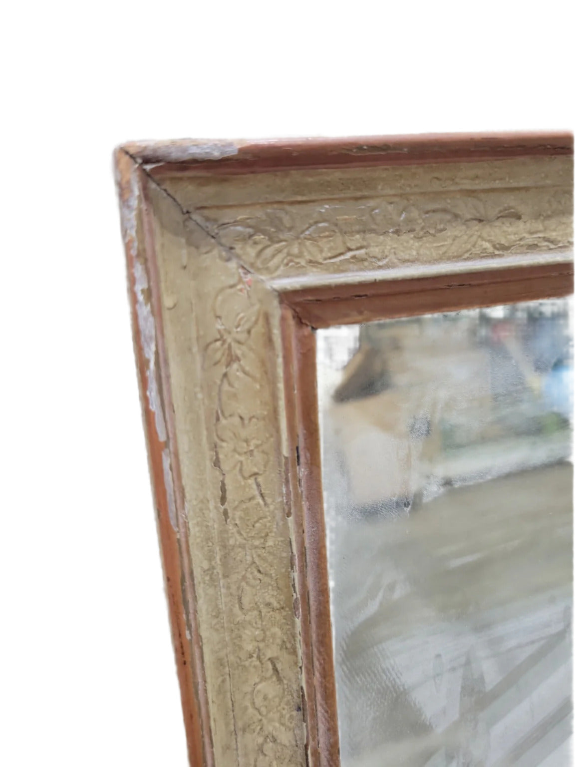 Description : This antique wall mirror features a delicately carved floral relief frame, worn with age and patina that enhances its character. The frame’s soft gold and reddish tones evoke classic Victorian or early 20th-century decorative motifs. The silvering on the glass shows natural deterioration and ghosting, a hallmark of true vintage mirrors that adds atmospheric charm. It’s an excellent candidate for decorative use in entryways, dressing rooms, or vintage-styled commercial interiors. The mirror has a wood-backed construction and original frame details intact, though minor corner wear is visible.