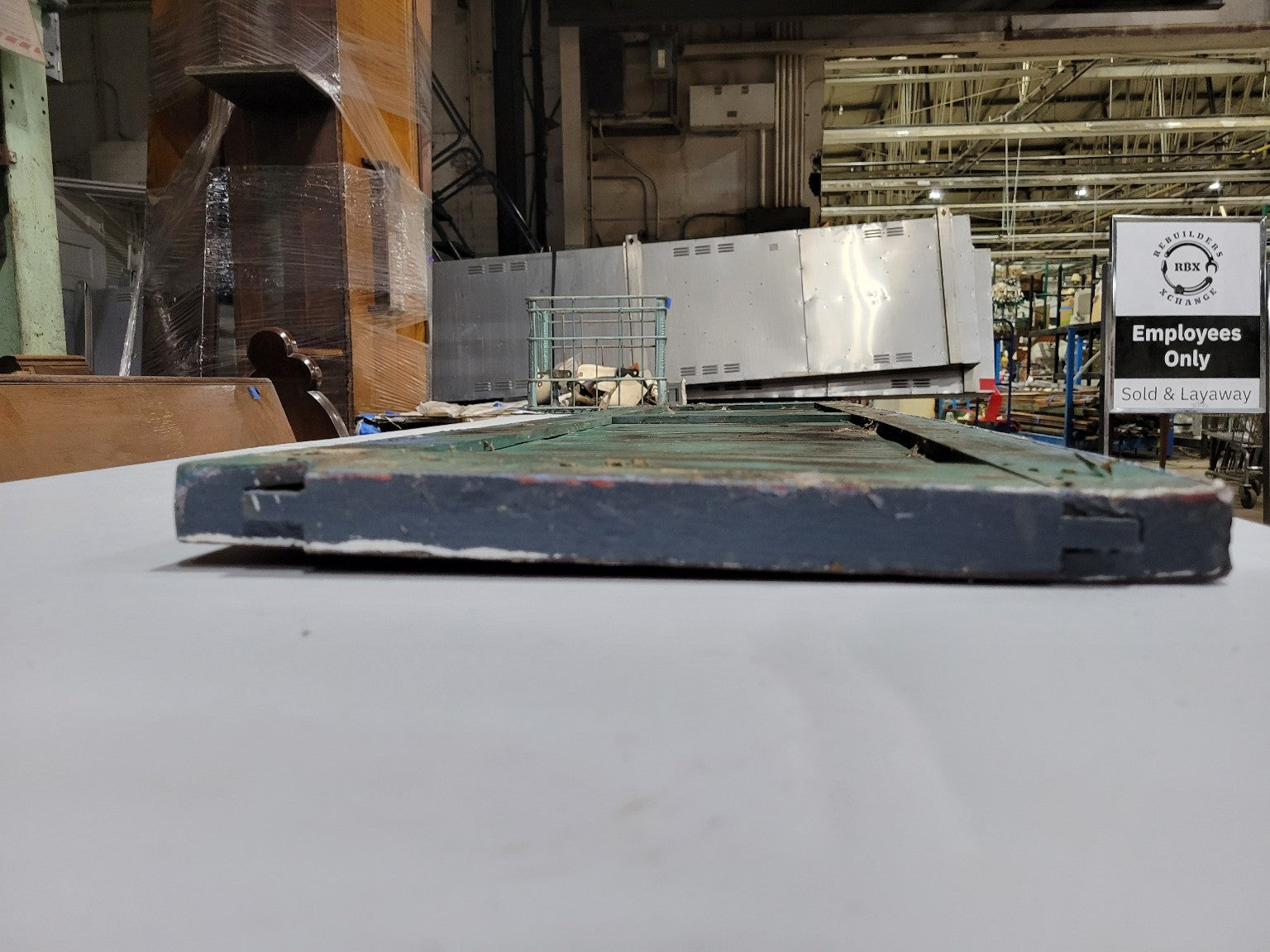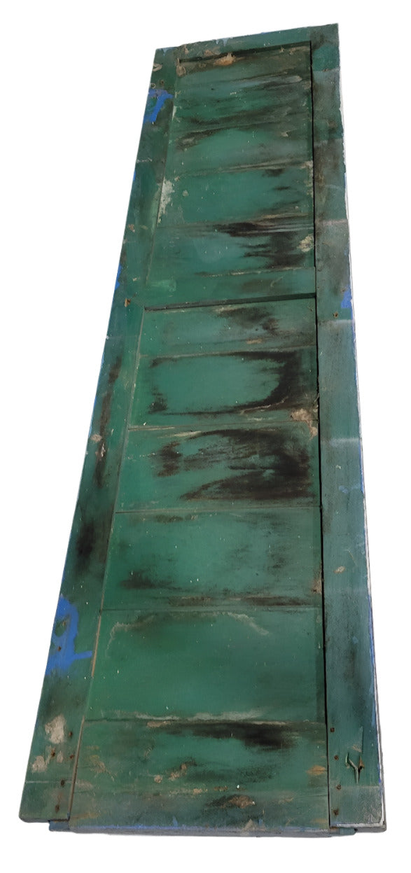 This salvaged wood shutter features a classic louvered design on one side and a solid green-painted reverse, showing decades of layered finishes. Measuring 55 ¾" T x 14 ⅛" W x 1 ¼" D, the piece is ideal for architectural restoration or decorative repurposing such as a wall feature or headboard accent. The louver blades are intact, though worn, and the frame shows weathered edges and surface wear, consistent with prolonged outdoor exposure. Paint layers reveal a rustic palette of aged brown and green, with hints of underlying blue—offering a naturally distressed aesthetic that would appeal to vintage decor enthusiasts and salvage creatives alike.