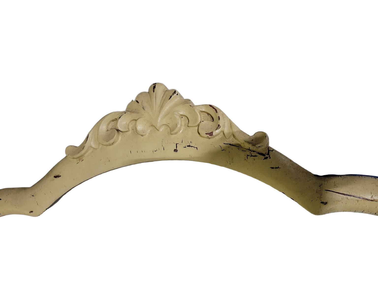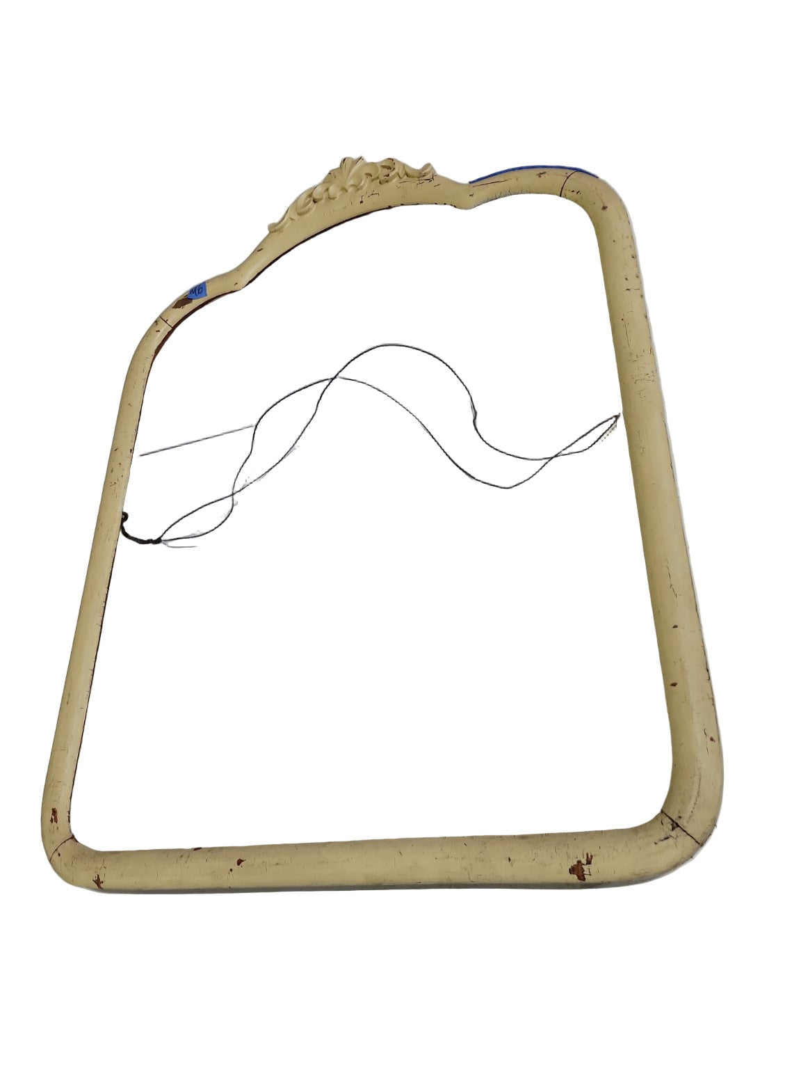 This antique mirror frame features a gracefully arched silhouette with a carved floral crest and a distressed cream-painted finish. Measuring 33½" in height, 24" in width, and 1" in depth, the frame shows natural age wear, including cracks and layered paint, revealing hints of its original wood. Perfect for restoration, repurposing as wall décor, or for re-glazing as a mirror.