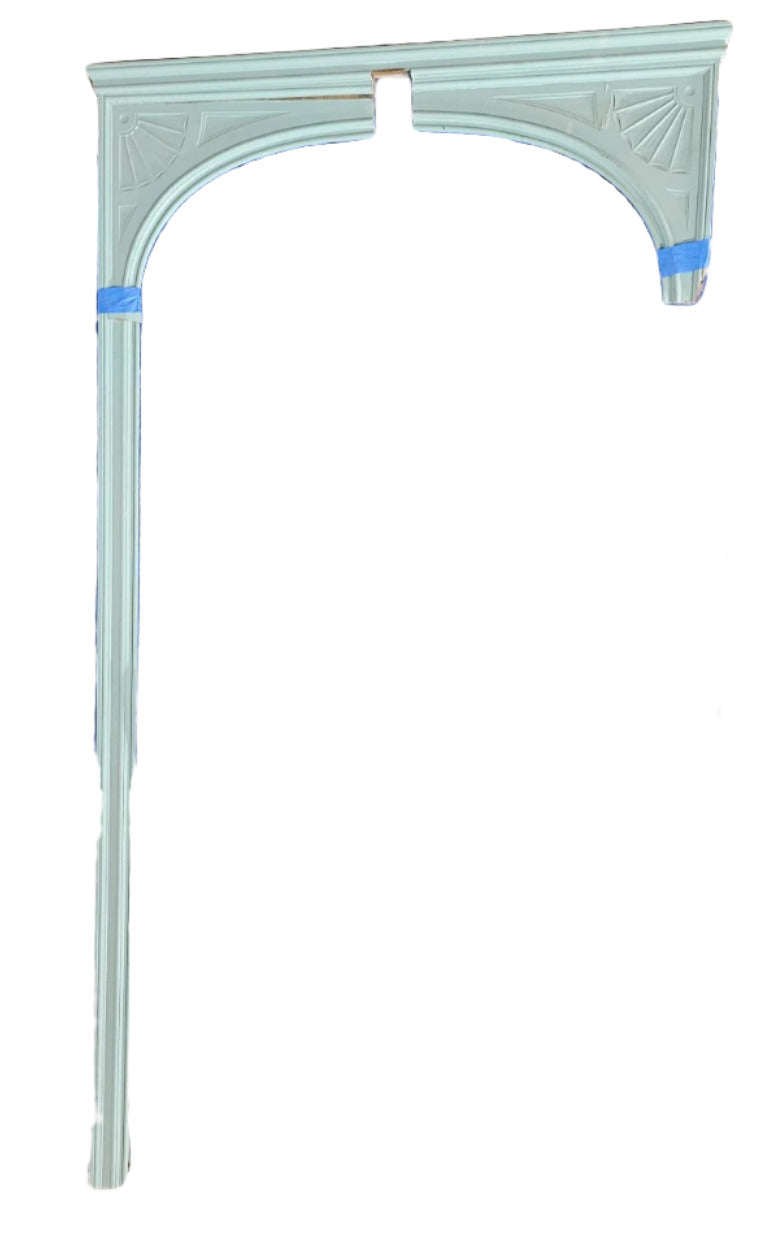 This ornate wood valance or arch-top entry surround features symmetrical curved supports and fanburst relief carvings in each corner. Finished in a pale mint green paint, the piece exudes early 20th-century institutional elegance and was likely once used to frame a passageway, window, or shelving unit. Though it shows separation at the center joint, the piece is structurally salvageable and ideal for reuse in upscale interior decor, theatrical design, or restoration settings.