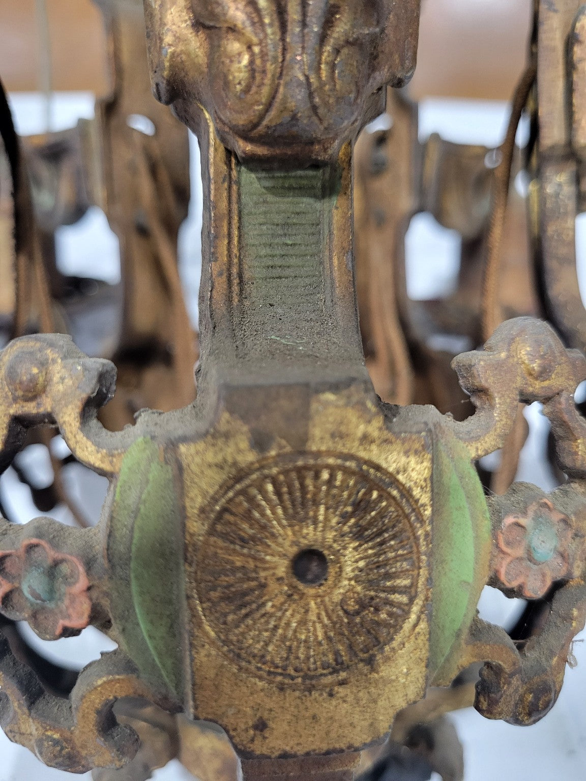 This 5-light chandelier is a striking example of Art Deco lighting design, featuring a cast iron frame adorned with original polychrome detailing in green, gold, and red. Intricate floral and scrollwork motifs accent each arm and body panel, showing off the craftsmanship of early 20th-century fixture makers. Though missing some sockets and wiring, the structure and paint remain in excellent restorable condition. This chandelier is ideal for collectors, restorers, or period homes seeking an authentic vintage centerpiece.