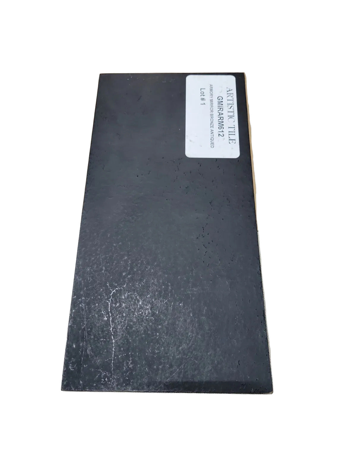 This set includes five decorative glass field tiles from the Artistic Tile Charleston Mirror Collection in the Armory Mirror Bronze Antiqued finish. Each tile measures approximately 6 inches by 12 inches by 1/8 inch thick and features a textured antiqued mirror surface with mottled bronze and smoky reflective tones. The irregular reflective pattern creates a vintage-style patina that adds depth and character to backsplashes, accent walls, bar areas, or decorative installations. The tiles are made of glass with a mirrored antiqued finish designed to mimic aged metal or vintage mirror surfaces. Their elongated rectangular shape makes them suitable for horizontal or vertical installation patterns. These tiles are part of a designer tile line by Artistic Tile, known for specialty architectural surfaces used in residential and commercial interior design. This listing includes five matching tiles.