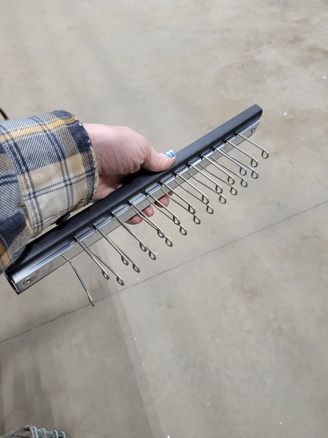 This striking tie rack features a matte black wooden backplate paired with a bright chrome-finished metal hook rail, offering both style and utility. Designed to mount easily to a closet wall or door, it includes 20 swivel wire hooks for ties, necklaces, or small accessories. The unit measures 13 7/8" L x 1 3/4" W and is distinguished by its dark finish, giving it a sleek, modern edge while maintaining its vintage function. Excellent for retro closet restoration or stylish organization in compact spaces.