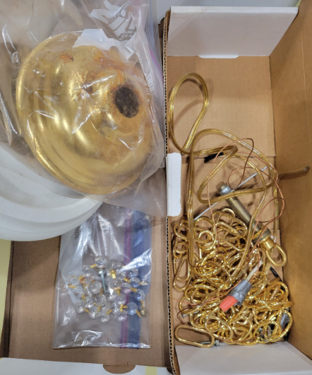 Description : This vintage chandelier parts kit includes a brass ceiling canopy with some tarnishing, a collection of golden wiring, and glass crystal drops ready for restoration. Ideal for those looking to rebuild or refurbish a classic chandelier, the kit offers a great starting point for a lighting restoration project.