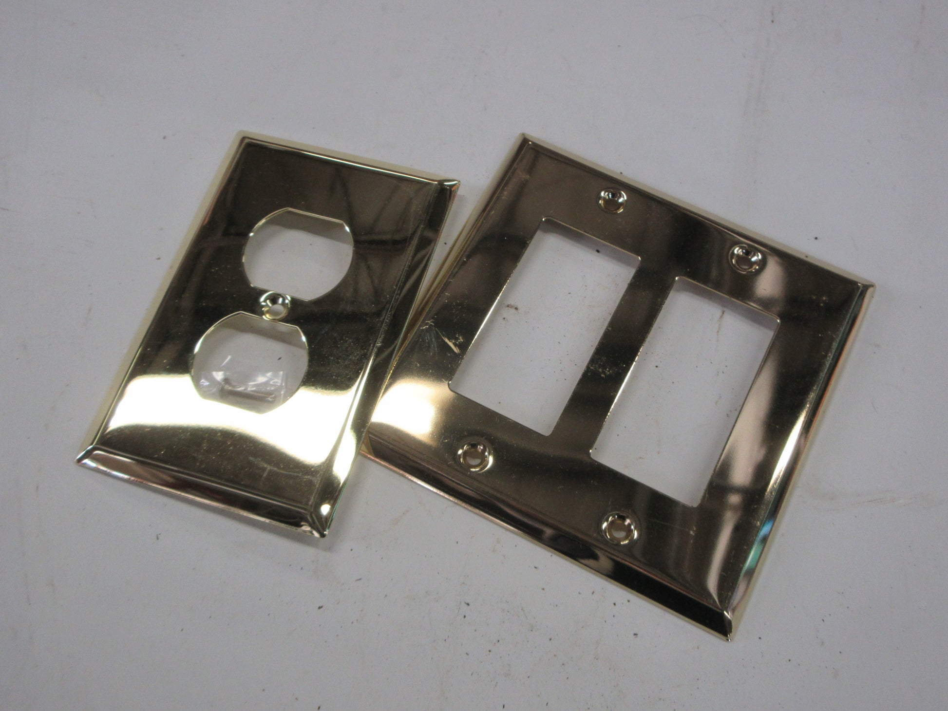 Description : Brass finish metal outlet and double switch plate. Measure as follows: Outlet 4 7/8"H x 3 1/8"W Switch 4 7/8"H x 4 7/8"W