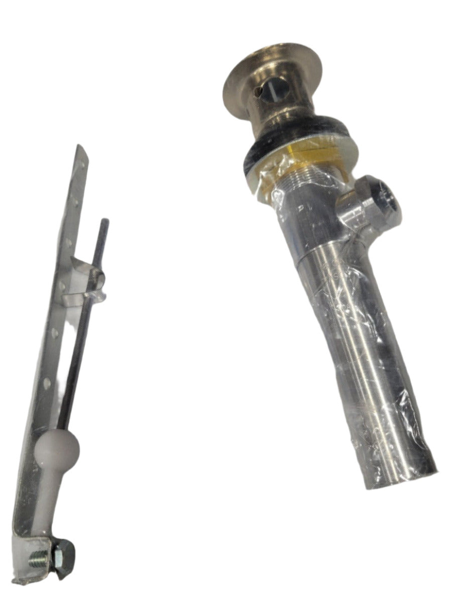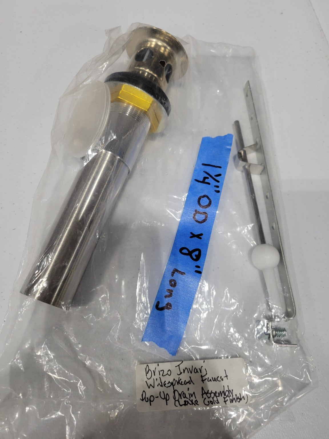 This is a Brizo Invari pop-up drain assembly designed for use with widespread faucets. Finished in a warm Luxe Gold, it includes the full lift-rod mechanism and is still sealed in original packaging. The durable 1 ¼" OD brass body measures 8" long and is compatible with most standard bathroom sink configurations. The Brizo Invari collection is known for its refined, modern-traditional aesthetic and premium build quality, making this a stylish and functional upgrade for luxury bath installations.