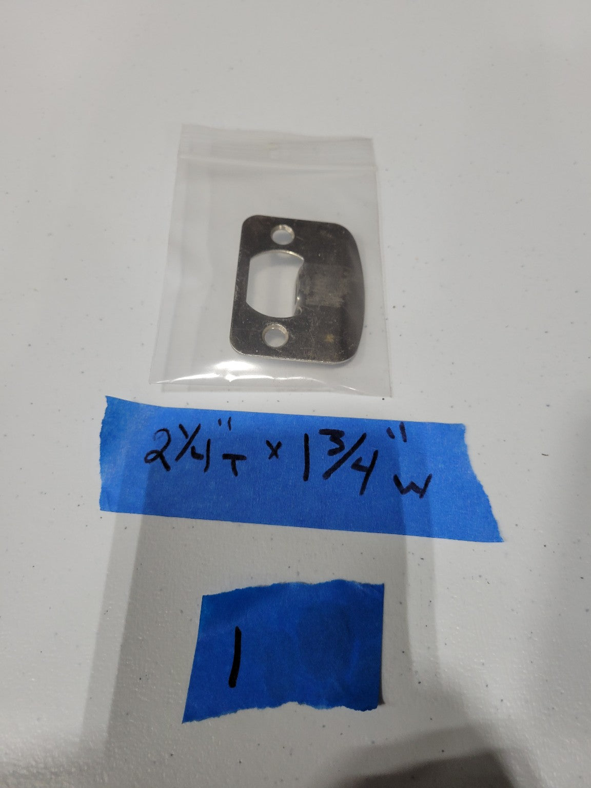 This brushed steel strike plate measures 2¼" tall by 1¾" wide and is designed for use with standard latch bolt door hardware. It features a smooth, rounded lip and a rectangular central cutout, flanked by two countersunk mounting holes for flush fitment. The finish is slightly worn, giving it a soft industrial character while maintaining full functionality. Ideal for restoration or replacement on residential interior doors.