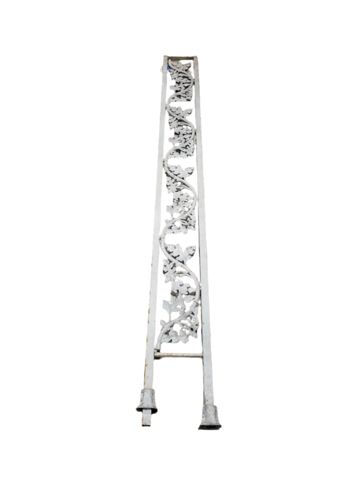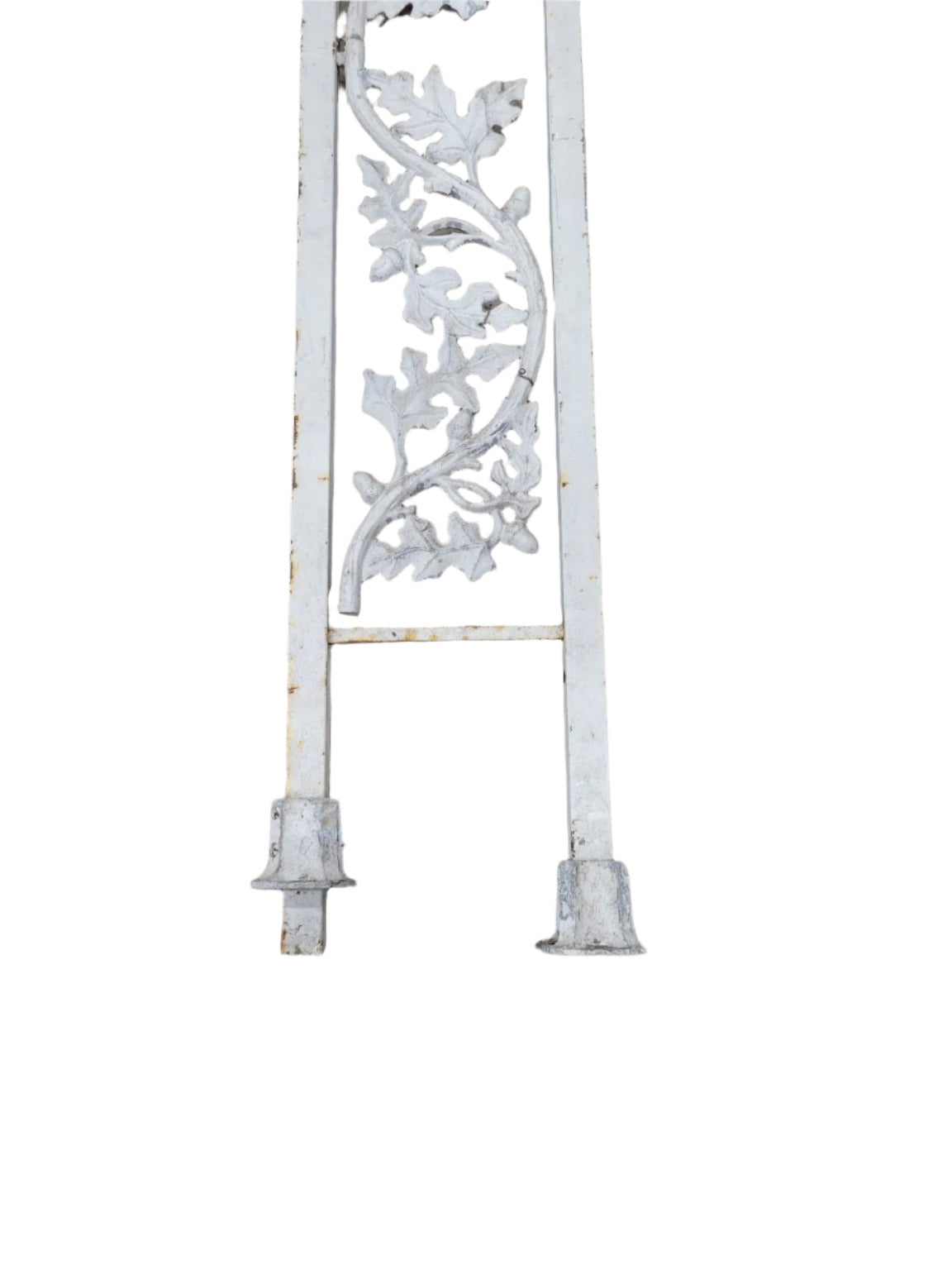 This 8-foot architectural insert features a beautifully detailed oak leaf and vine scroll pattern framed in cast iron. Measuring 10" wide by 1¼" thick and 96" tall, the piece likely served as decorative railing, panel work, or exterior grille on a historic structure. The iron frame is painted in a weathered white and shows signs of aging, with patina and surface rust consistent with outdoor exposure. The oak leaf motif hints at late Victorian or early 20th-century craftsmanship, making it ideal for restoration, garden trellising, or as a bold wall accent.