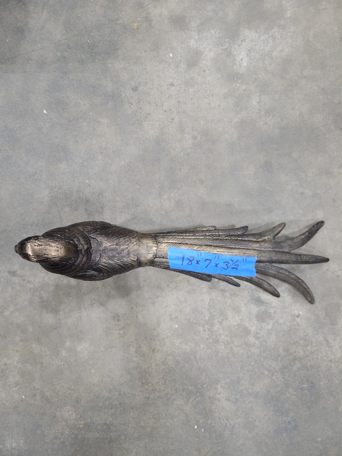 Detailed cast metal sculpture of a pheasant with long tail feathers, finished in a dark bronze tone. The figure displays fine texturing along the body, wings, and tail to resemble feathers, standing in a lifelike pose.
