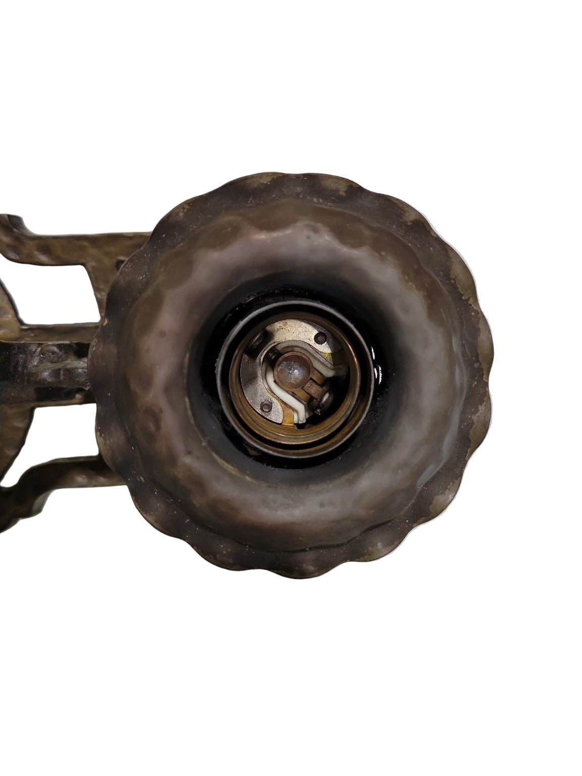 This original early 1900s ceiling-mounted light fixture by Sterner Arts Co. showcases signature Art Nouveau craftsmanship in hammered brass. The design features twin tulip-form sockets with punched quatrefoil motifs and scalloped bobeches, joined by curved arms that flow into a twisted center loop finial. Though currently unrestored and retaining its original cloth wiring, the piece remains structurally sound and displays an aged patina consistent with its age. It is an ideal candidate for professional restoration or historical display in its current condition.