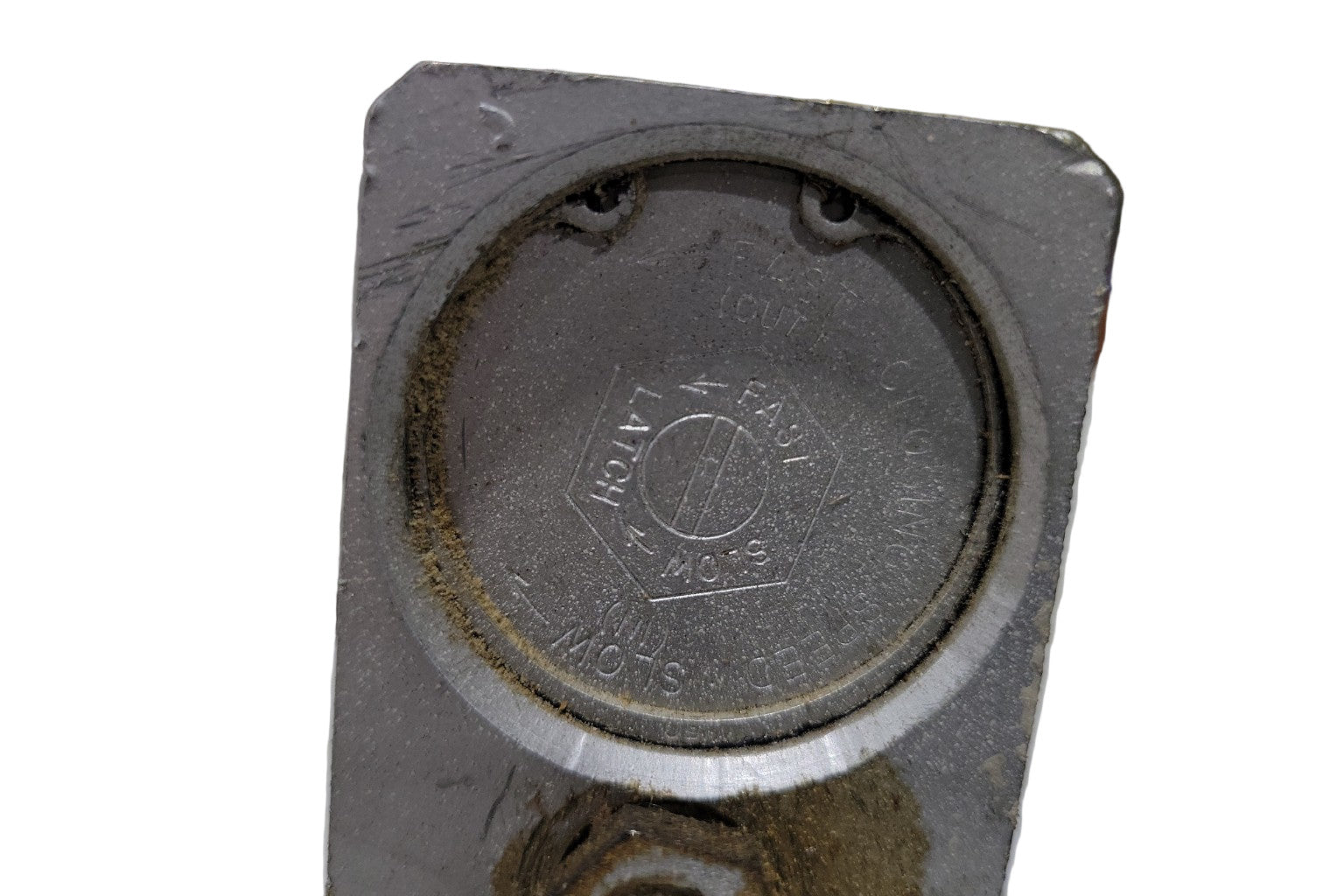 Condition: Functional with surface wear and rust; latch and sweep speed dials intact