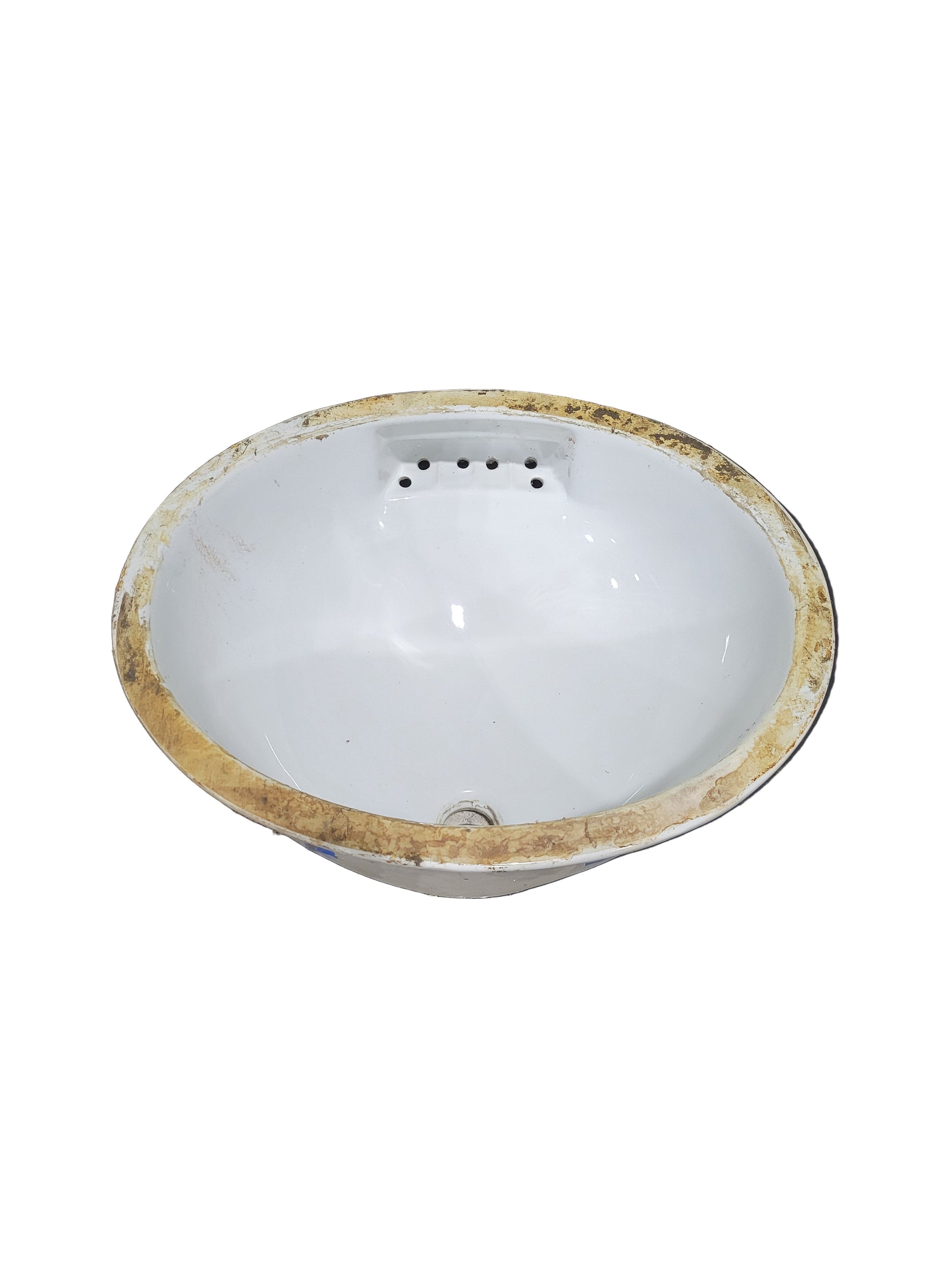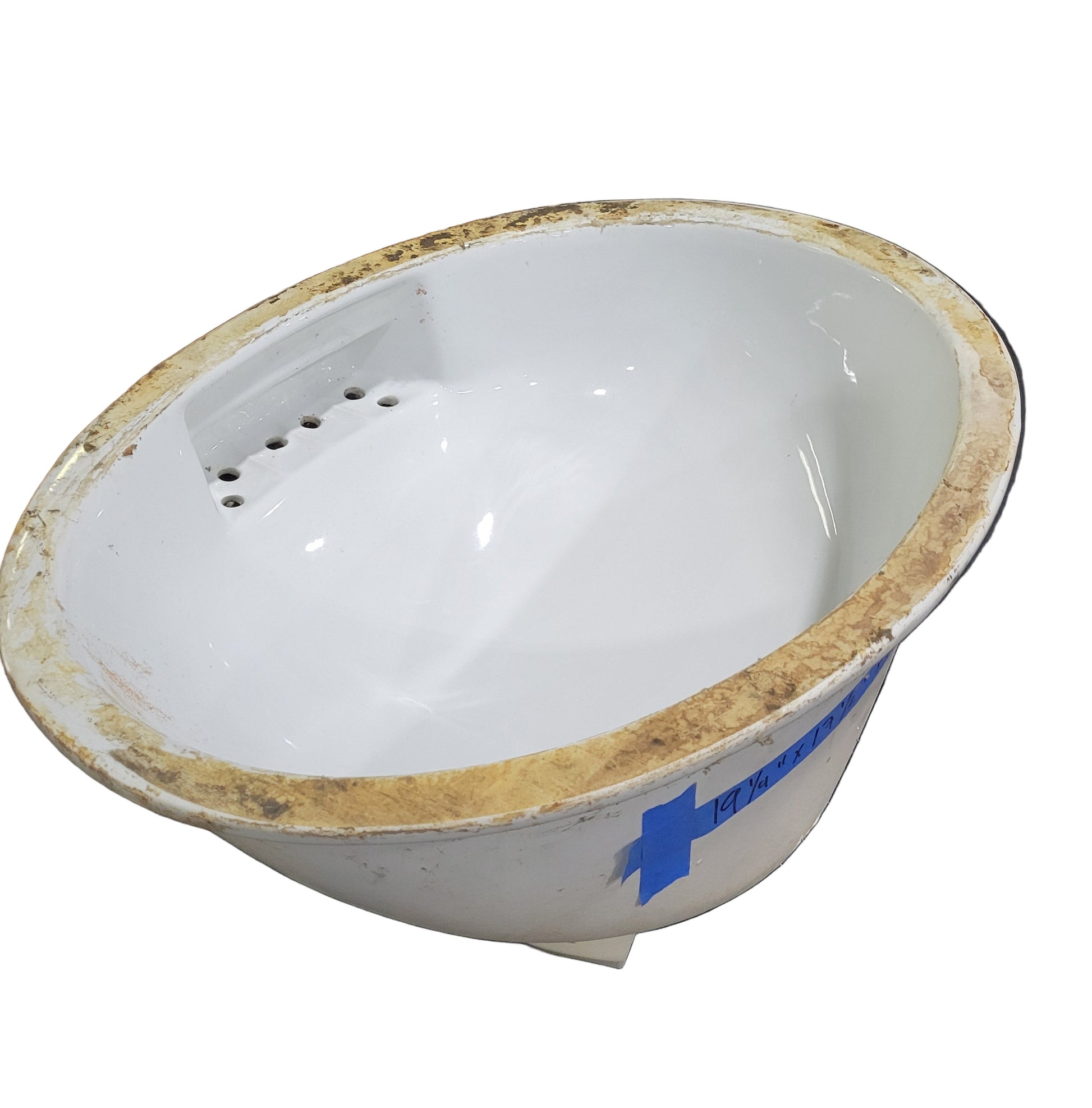 This vintage Crane undermount bathroom sink is crafted from vitreous china and features an elegant integrated soap dish in the overflow area—a signature detail of mid-20th-century American bathware. Measuring 19 ¼" W x 17 ½" D x 10" H, this sink combines functionality with refined industrial design. Its glossy white enamel interior contrasts beautifully with its aged underside, reflecting quality craftsmanship typical of Crane’s U.S.-made fixtures. Built to last, this piece would make an excellent addition to a period-correct renovation or a high-end vintage-inspired remodel.