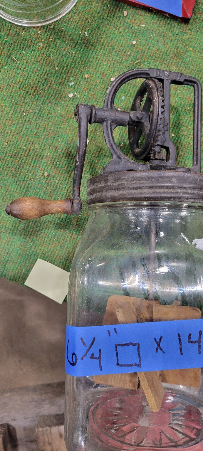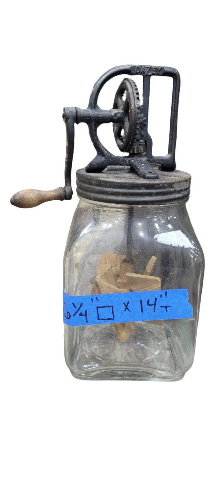 Antique Dazey butter churn featuring a square clear glass jar with cast iron gear housing and a wooden hand crank. Internal wooden paddles remain intact and functional. Model "34B" is embossed on the gear assembly, a hallmark of authentic Dazey churns.