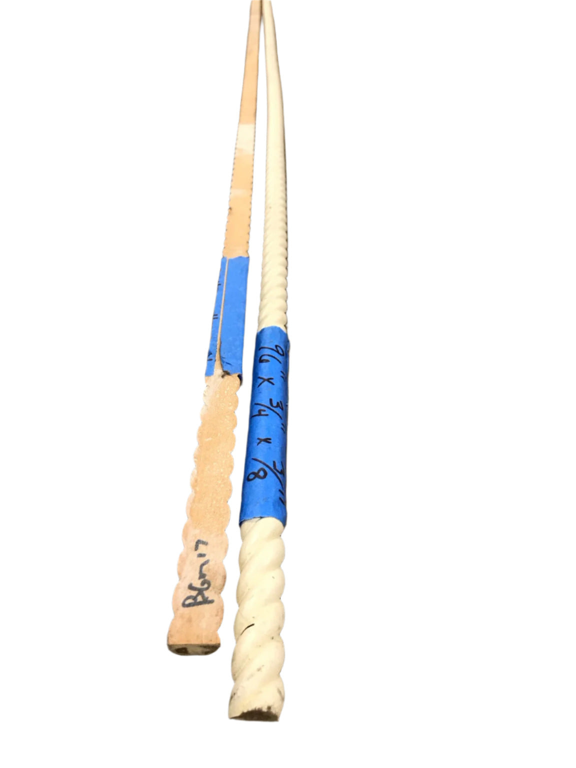 A set of two decorative trim pieces, one featuring a twisted rope design and the other a scalloped edge detail. Each piece measures approximately 96" x ¾" x ⅜". The twisted trim is painted white, while the scalloped trim is left in natural wood. These versatile trims are ideal for enhancing furniture, cabinetry, or interior decor projects.