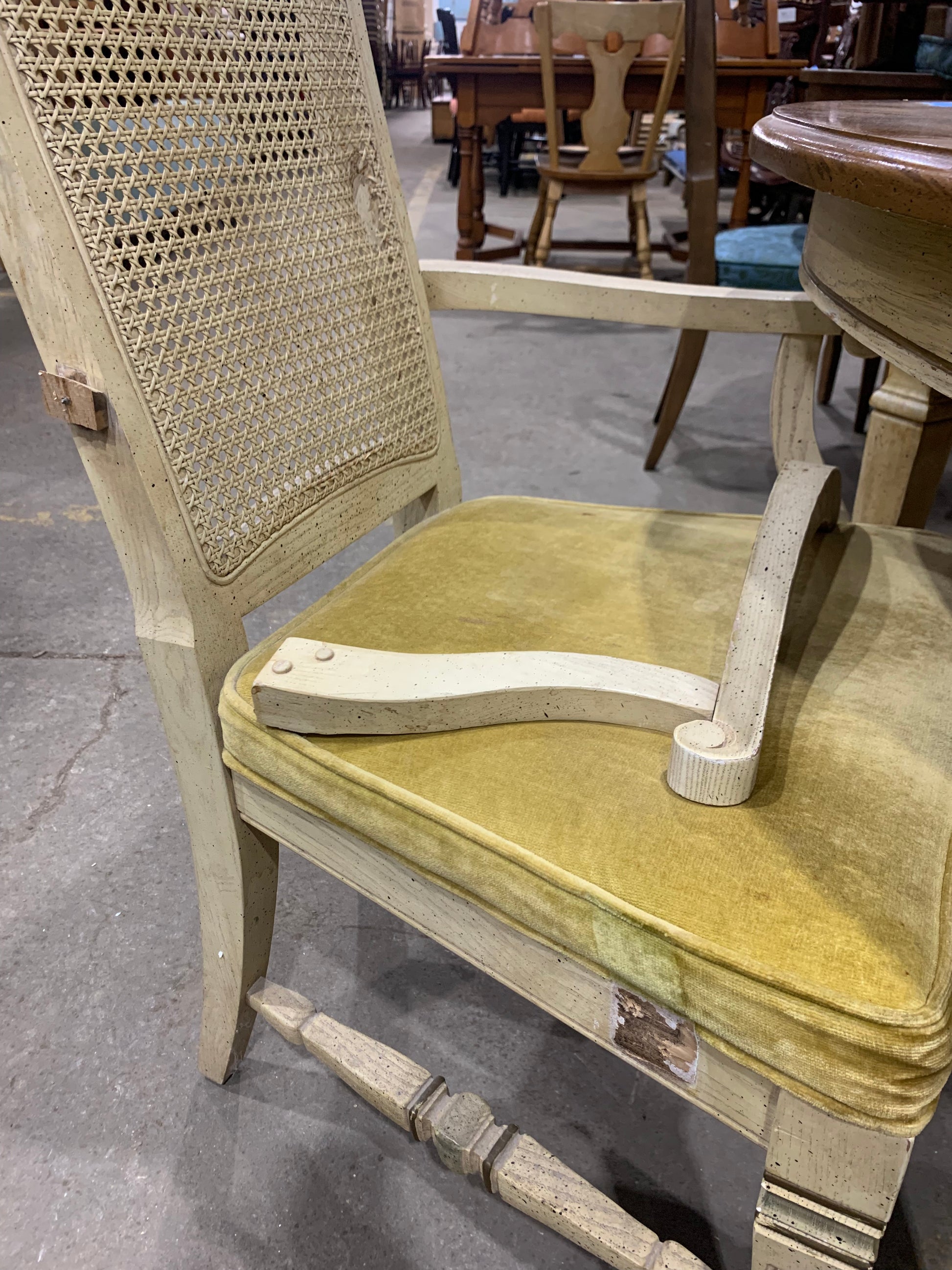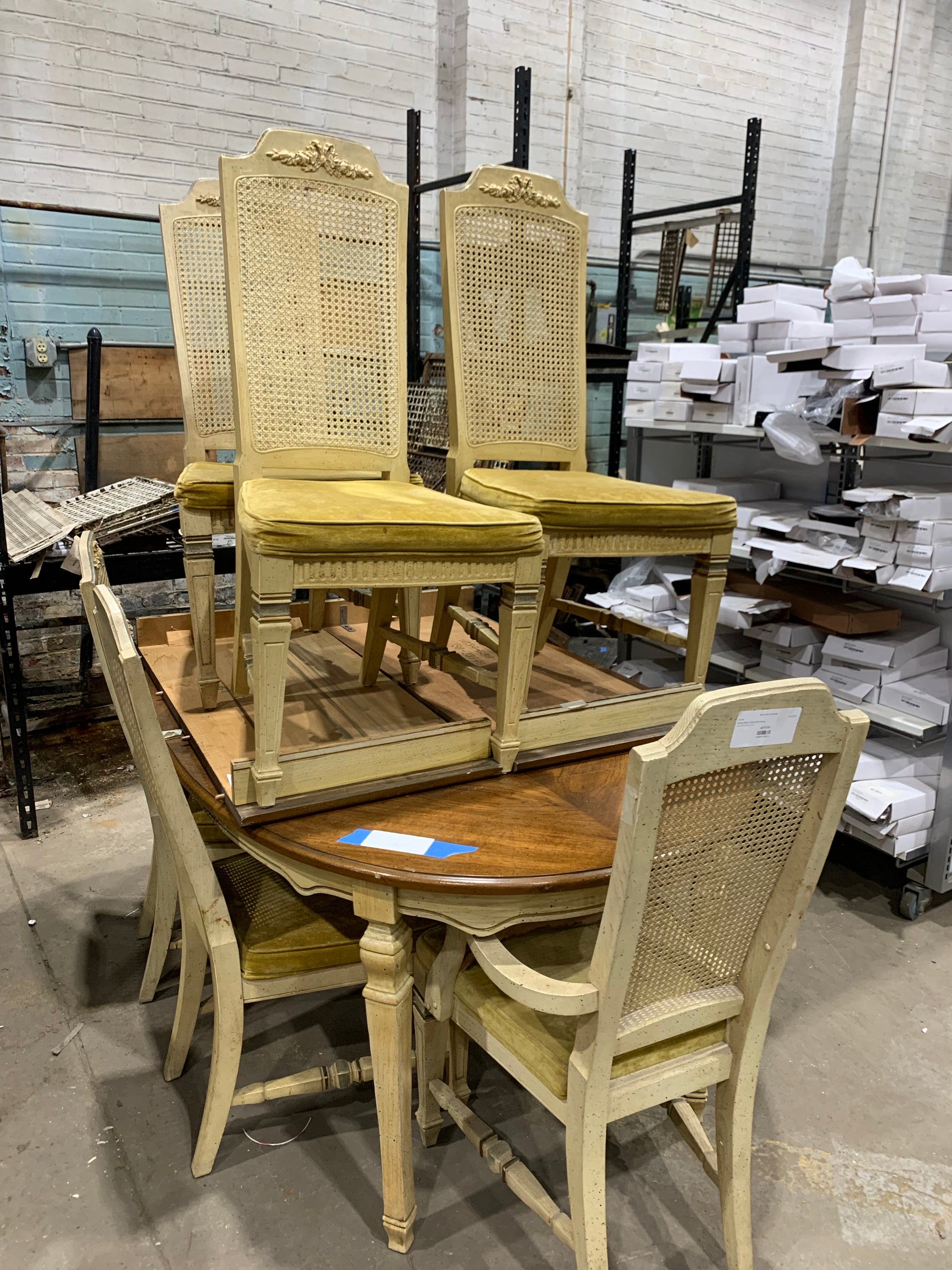 Description : Dining room table with two leaves, and six chairs.