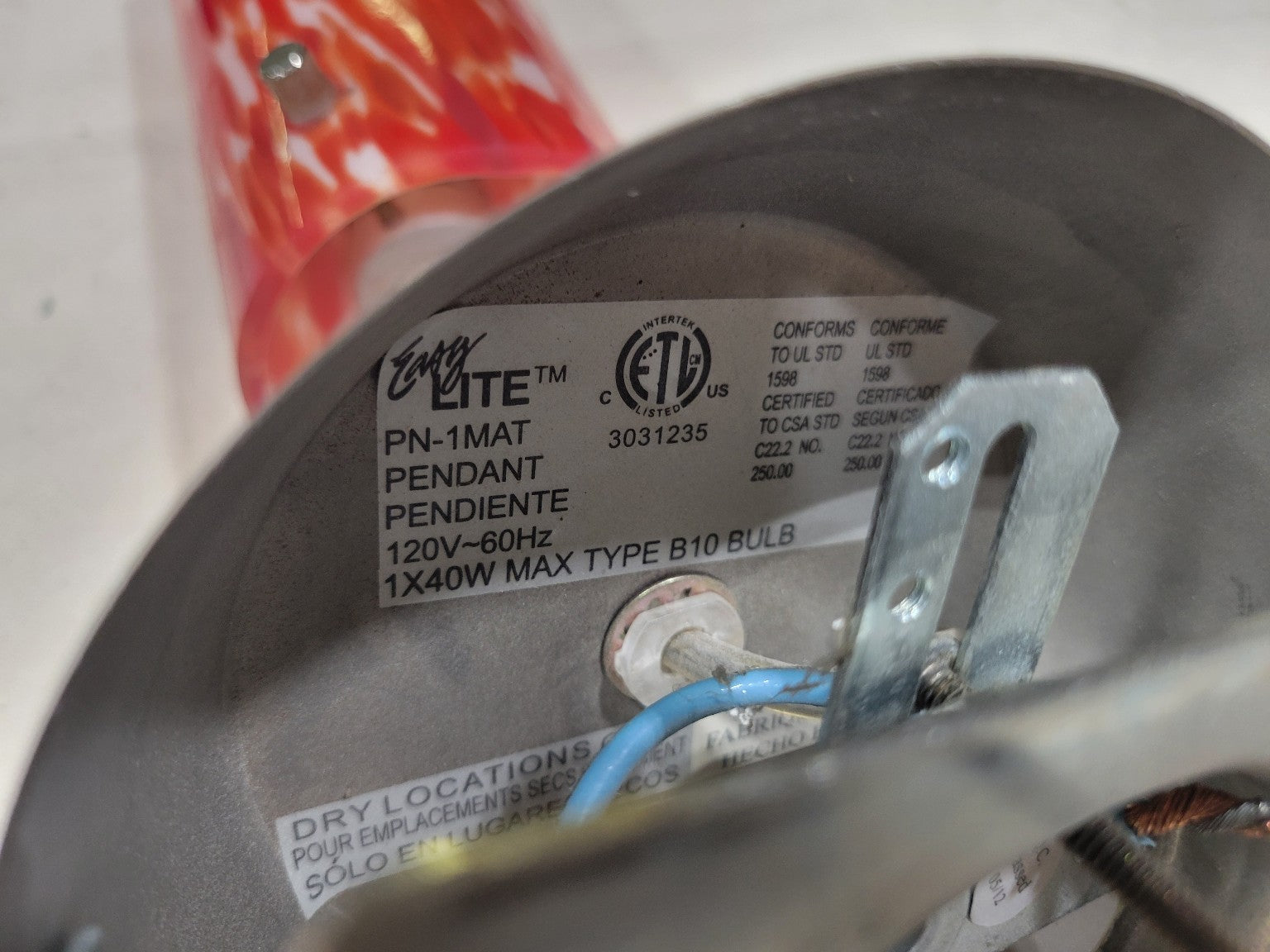 This Easylite™ PN-1MAT pendant light features a striking red art glass shade with a molten, flame-like pattern, ideal for accent or task lighting. Measuring 3" in diameter and 8⅝" in length, it includes a brushed metal escutcheon for clean ceiling installation. Designed for dry locations, it runs on 120V and takes a single 40W max B10 bulb. The vivid coloration and tubular form make it a bold choice for kitchen islands, entryways, or creative commercial spaces.