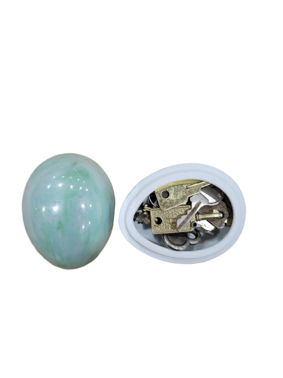 A glossy, speckled light green ceramic egg with a removable top, revealing a small storage compartment. Commonly used to store keepsakes or jewelry, this delicate piece blends form and function.