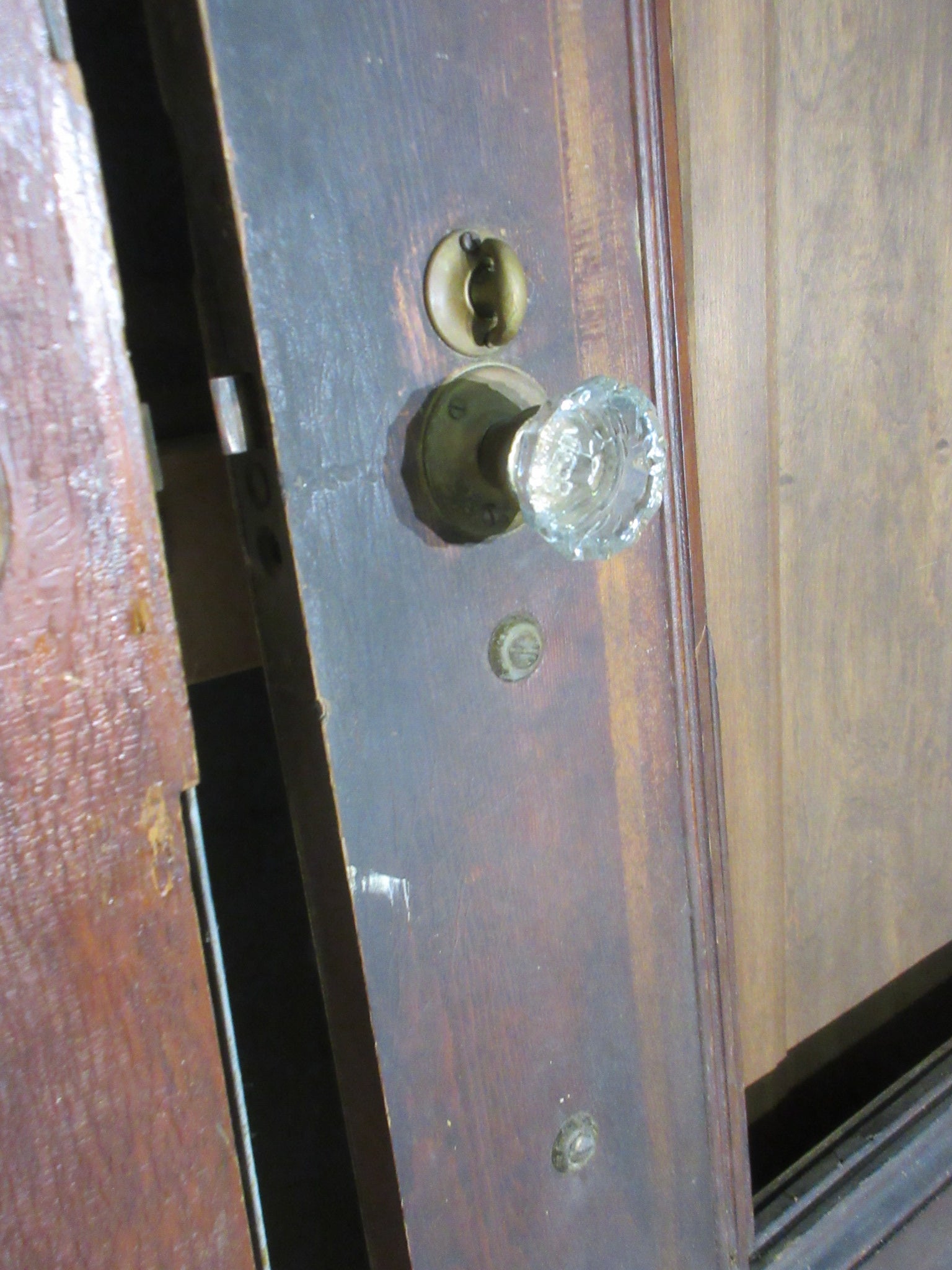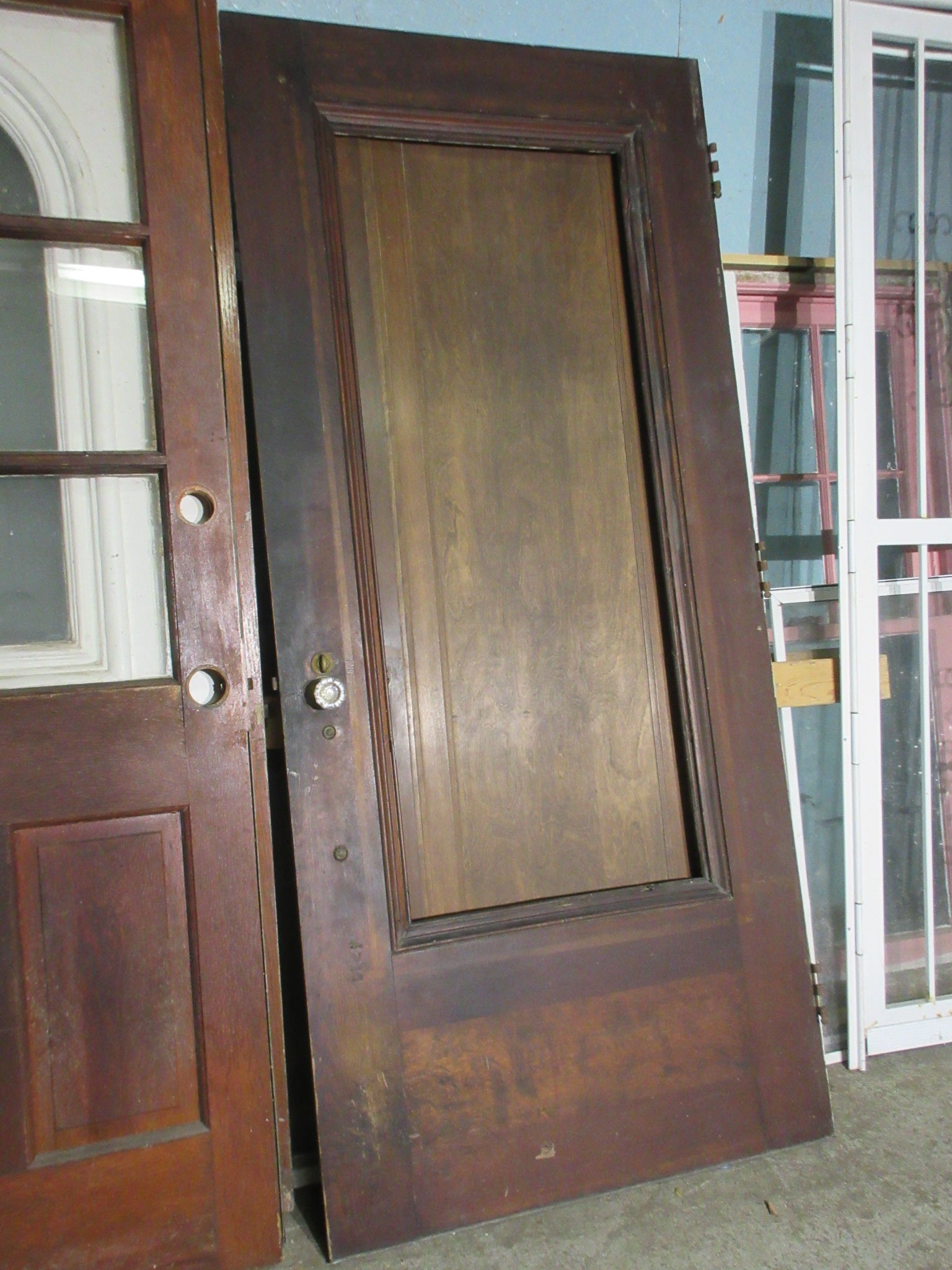 Description : Wooden entry door with frame for glass, thumb handle and glass knob.