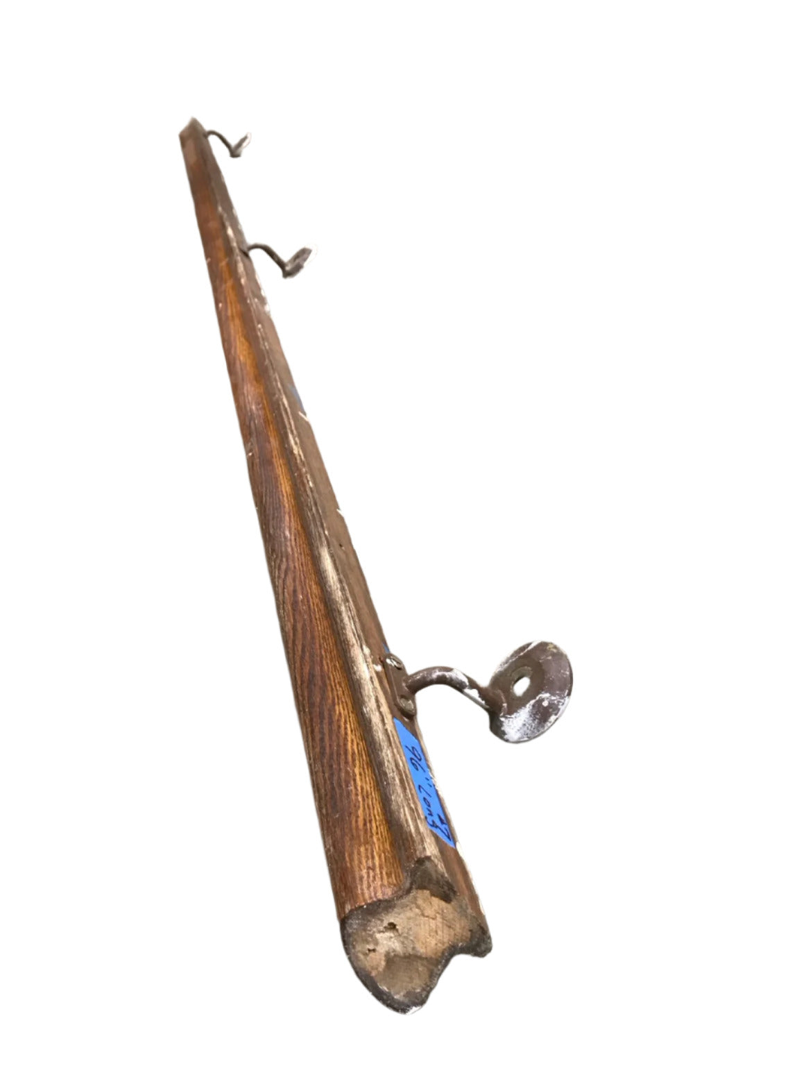 This reclaimed oak handrail measures 96 inches in length and is equipped with three metal brackets for wall mounting. It features a rounded profile with visible signs of use, including chipped ends and remnants of old paint on both the wood and metal components.