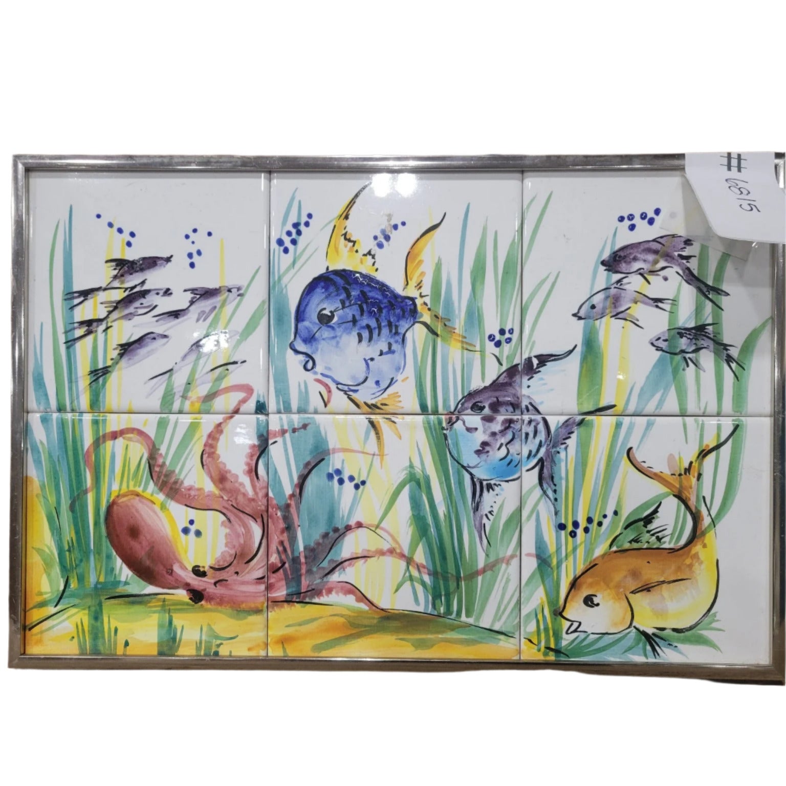 A vibrant hand-painted ceramic tile artwork featuring an underwater scene with various fish, an octopus, and aquatic plants. The artwork consists of six individual tiles, framed in a sleek silver-tone metal frame, giving it a contemporary yet timeless appeal. The bright colors and brushwork capture a whimsical and lively aesthetic, making it a great statement piece for coastal or nautical-themed decor.