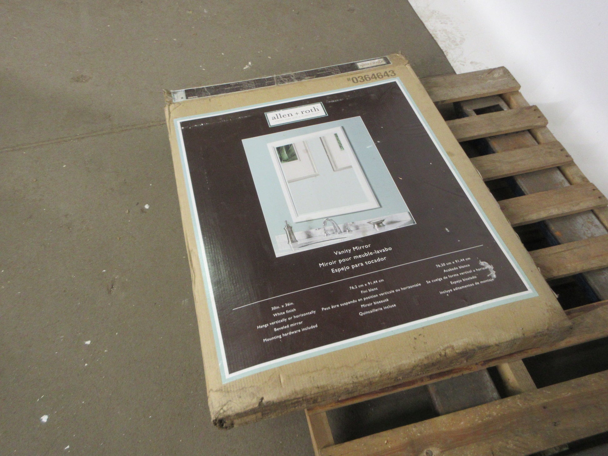 Description : Framed vanity wall mirror with white finish. Can be hung vertical or horizontal.